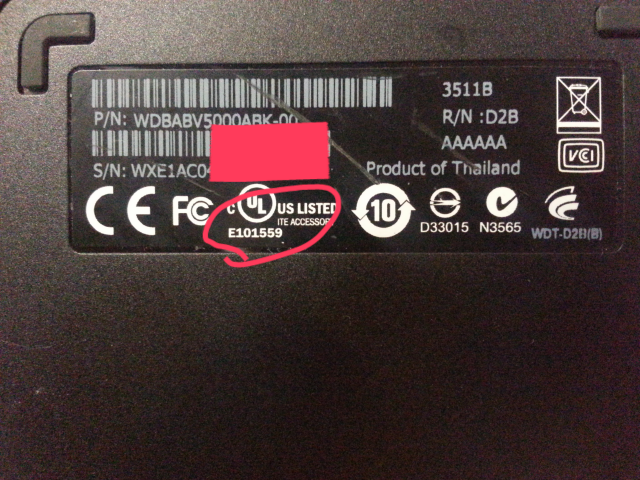 我看到UL安全認證標誌在WD行動硬碟500G的背後標籤的左下偏中間