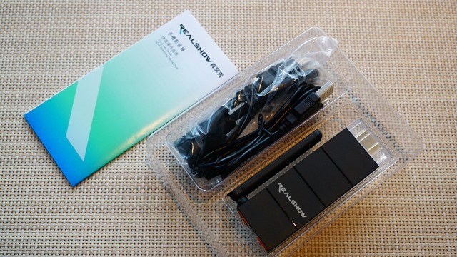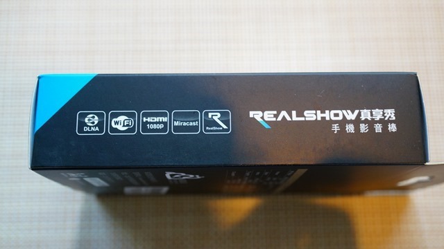 以黑色為主體色的RealShow真享秀手機影音棒外盒,正面就能看到部分真享秀手機影音棒的外觀。