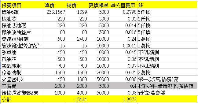 我的93每次的保養費都不超過八千元,最多的一次好像是七千多吧!因為我都不按照規定保養,機油,三到五千換,變速箱油八千到一萬換(這個會再縮短,因為找到便宜的),火星塞、水箱水,想到就換,其他的也是一樣,所以每次去保養很少換一大堆東西,可能只換機油或是變速箱油,甚至是火星塞!因為這樣,都該換的東西都分散了,等於分期付款....