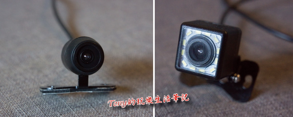 ▲最後因為我的車子本來就有倒車雷達,所以就以這兩款體積較小的鏡頭來試裝看看。左邊的試簡稱《小蝴蝶》的鏡頭,體積最小,但是沒有可調高低角度的功能,只能用手扳動角度固定,不是我想要的,但是體積最小是最好找到空間安裝的。右邊的是有帶燈的,只要有電源通電,旁邊的LED燈就會亮起,但我覺得沒啥用,甚至我一開始就想把LED給廢掉不用,最後試出來,只要降低供電電壓就可以不讓LED燈亮起(電壓要降到8V以下)。不過在測試時發現,方形帶燈的鏡頭,在左右兩邊的影像超模糊的,完全不能用,白白浪費了,而且倒車尺標是一直存在的,沒辦法選擇不顯示尺標,這個算是不合格了。