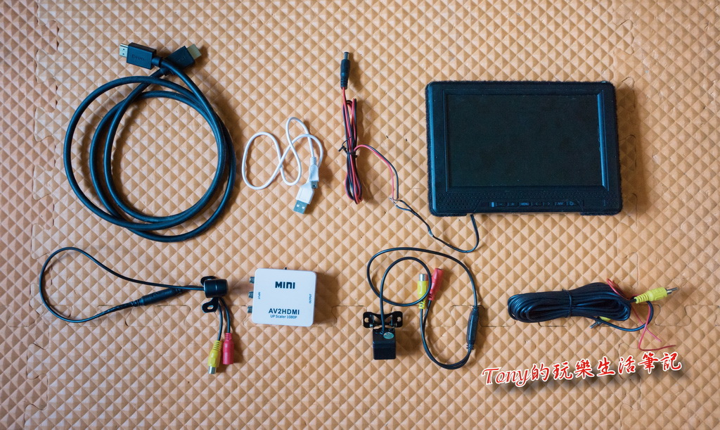 ▲先把所有要裝上車的器材全排在一起。本來應該是接台AV輸入的螢幕就可以用了,不過我手中現有的是一台HDMI輸入的七吋螢幕(以前拍影片時,用來接在單眼相機外接觀看用的),所以就需要多一個AV轉HDMI的轉接器(也需要額外多裝一個USB 5V的電源供應),還有一條HDMI的視訊線。等我另外訂購的AV輸入螢幕到貨的話,就可以少接一些線了。但還是先裝起來試看看這樣的效果再說。