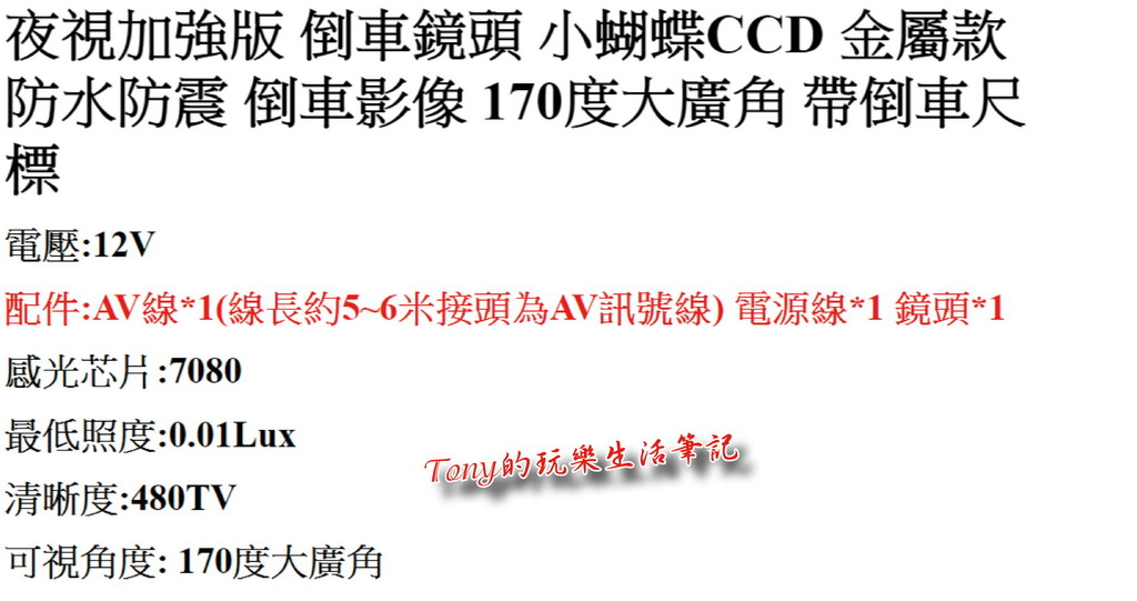 ▲最後就是選擇這個小蝴蝶鏡頭來安裝使用。這是我買的這顆鏡頭的規格,不過我安裝後看那個視角,大概也只有130度到135度之間,並不到170度的視角(跟我用大通V90的後鏡頭比較後抓的數據),不過在地下室使用的顯示,感覺不錯,亮度比眼睛看的還清楚。果然還是要有夜視版的才行。