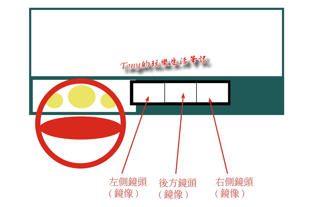▲三個螢幕剛好對應三個鏡頭,這樣左右加後鏡頭來用,全都顯示到同一個螢幕上時,一眼就可以看到全部,連點死角都沒有,這是我最想到的終極版本。