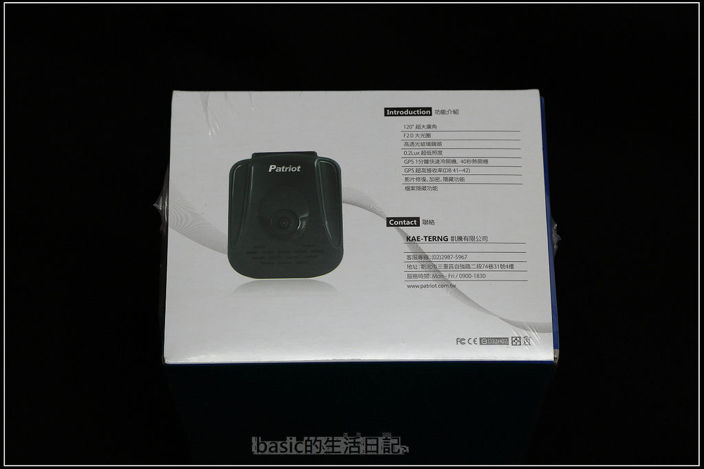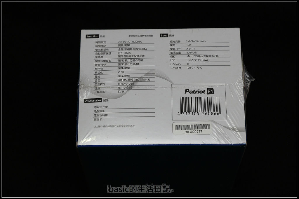 盒子背面標明了愛國者F1的規格 , 搭載有測速語音警示、GPS記錄、200萬畫素低照度CMOS感光元件、120度廣角拍攝、2.4吋TFT LCD液晶螢幕、720P錄影能力、 G-Sensor、420mAh內建鋰電池、以及ADR影像管理軟體等多元功能,是一款集多功能於一身的行車記錄器產品