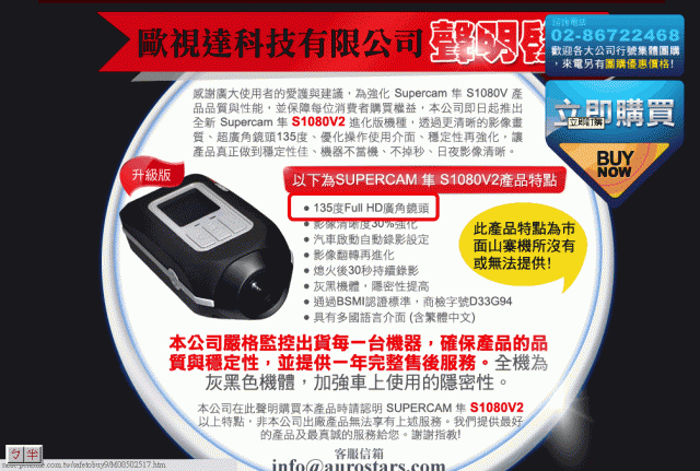 jiaming2018 wrote:1.角度v737w標榜120度、S1080v2標榜135度(v737w勝)v737w標榜120度廣角,實際上看起來真的拍出來的角度有大這下子就要問一下原廠啦,怎麼135度拍出來的像100度.....難到又是個1280*720與1920*1080的迷思... 下面是小弟從jiaming2018大哥您的回覆和圖片以及原廠的規格比較下來,理整出來的想法:a. 2台機器的實際規格比較下來,照道理來看S1080v2標榜的135度要比角度v737w標榜120度,實際錄下來的影片的畫面要來的大!b. 從您的2張角度v737w標榜120度和S1080v2標榜135度照片比較起來,卻是v737w勝!c. 難到又是個1280*720與1920*1080的迷思 ----> 我想應該不能這樣說,而是要從原廠的規格來看,其規格標榜135度Full HD廣角鏡頭小弟的初步想法會認為原廠的規格和實際寫的不符!原廠在其網頁有特別標示出135度Full HD廣角鏡頭下面為小弟從官網http://supercam.aurostars.com/那裡擷圖過來,小弟有用紅色框框框起來的部份!這個也是原廠特別強調的賣點之一!