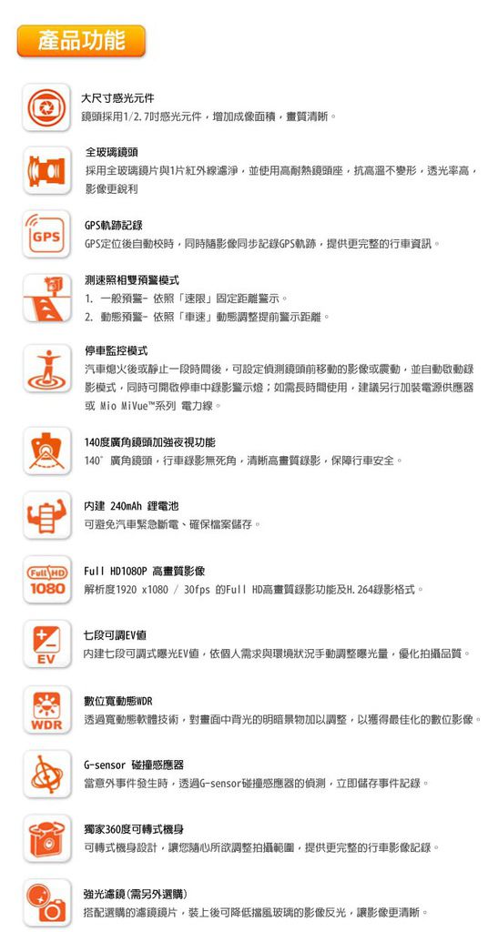 附圖為一些官方主打的Mio MiVue 518 行車記錄器功能,有興趣的朋友可以參考一下~~
