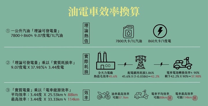 另外,根據論者質疑「電動車只是將污染轉移到電廠」,這樣的推論忽略了「能源轉換效率」專家計算,就算發電廠的效率,經過層層轉換會遞減,最後還是比油車環保很多,能源轉換效率是油車的1.5~2倍,因此,電車比油車環保節能,是不爭事實。換句話說,個人覺得汽油應該拿去發電廠燒掉,還比直接加到汽機車裡面燃燒,節能1.5~2倍。