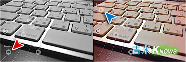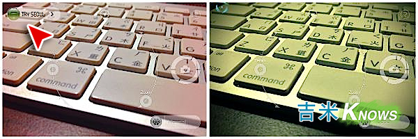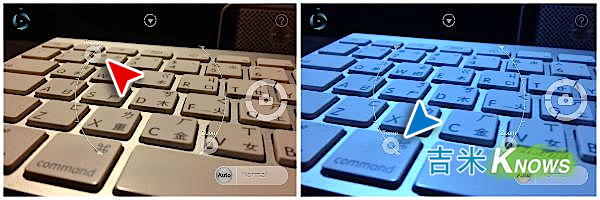 向左滑動是濾鏡及場景的選擇,而向有滑動則是拍攝時的細部調整。最有側的的功能為相片的「銳利度」,仔細觀察左有兩張照片,是不是有明顯的差別? |
