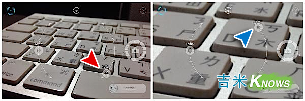 而在主畫面上,有兩個弧形指標可移動,畫面上的範例圖就是放大縮小的使用方式,只要拖拉右側的滾輪即可,調整時還會顯示放大倍率。 |