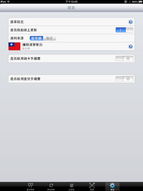 設定的部份,這個版本增加了匯率更新來源選擇與購物清單的幣別設定,匯率更新來源這次新增 Yahoo 的匯率資料來源,你可以根據自己的喜好來選擇更新的來源,如果有更新失敗的情況,除了可以更換更新來源試試看之外,也可測試看看你的設備是否可以連到鉅亨網和香港Yahoo,如果網頁的連結是正常的,基本上更新都會成功,但更新的速度要看你使用的是 3G 網路還是 WIFI 網路,如果狀態還在「更新中....」表示更新還在進行,而不是無法更新,更新失敗或成功,最後都會有訊息顯示,請多留意一下。