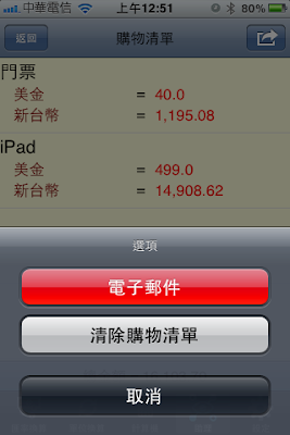 購物清單可以 E-Mail 給自己或其他人,也可以全部清除,或是在某一筆上往右滑動,就可以選擇單筆刪除。