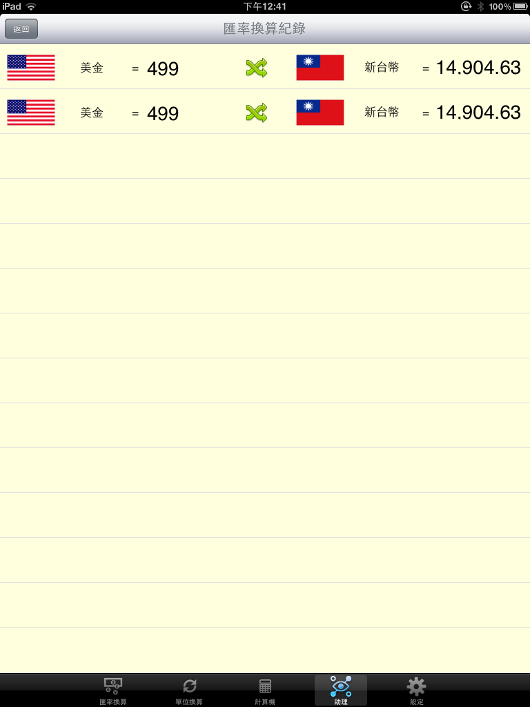 助理的頁籤裡面包含「匯率轉換記錄」、「單位轉換記錄」、「購物清單」三種資訊。