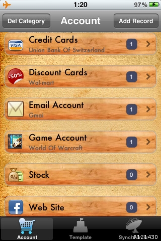 AccountKeeper$1.99>>FREE (3.0M)帳號密碼的記錄軟體,上次沒抓到MyWallet可以試試這個,介面顏色比較活潑,iCON也比較多,初次登入會要求登入帳密,帳號不用打,密碼是ipassword
