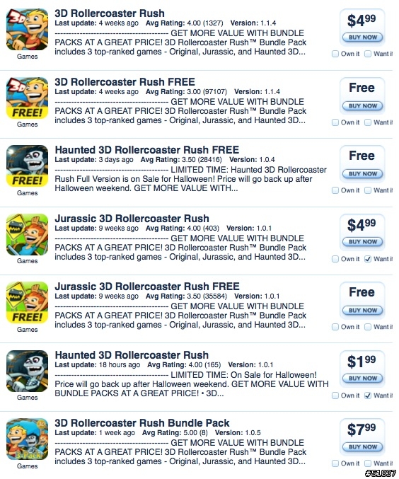 Haunted 3D Rollercoaster Rush雲宵飛車系列,當初看圖不覺得好玩,去apple store 玩一次後,欲罷不能,免費版都不夠玩。Rating 4.0Halloween weekend limited special sale $1.99 >>>$0.99APP STORE全系列的價格,比較起來就知道划算了