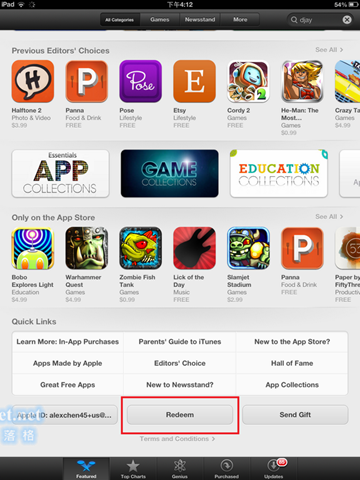 將App Store的“Featured”頁面滑到最下方,點擊“Redeem”來進行儲值。