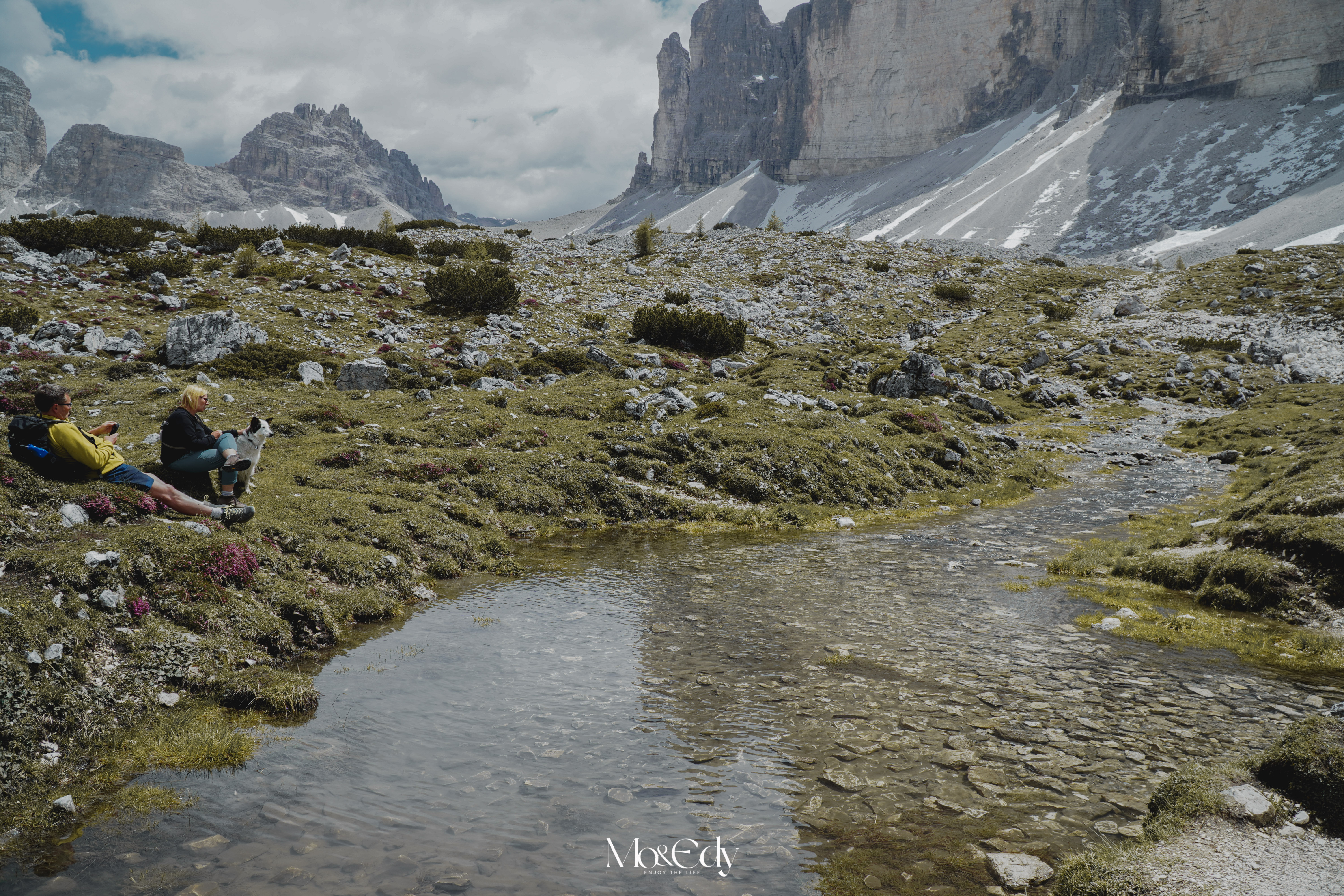 由於我們來的時間點還在休假期間,Rifugio Locatelli/Drei Zinnen Hütte尚未開始營業,幸好有攜帶乾糧和優格在身上,一起在山屋旁的座位區果腹。同時在觀察著歐洲人在登山健行時,與我們有什麼不一樣。