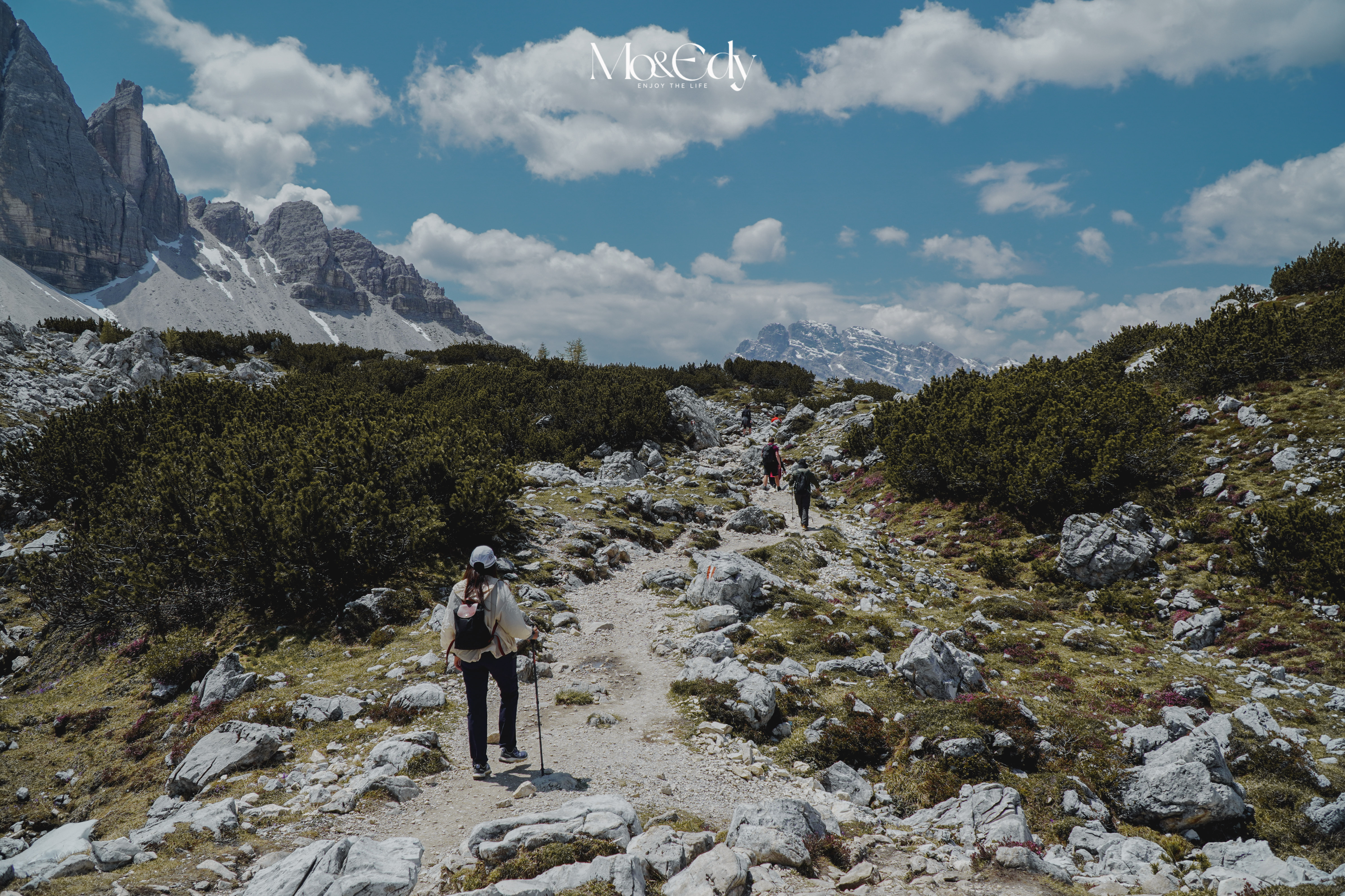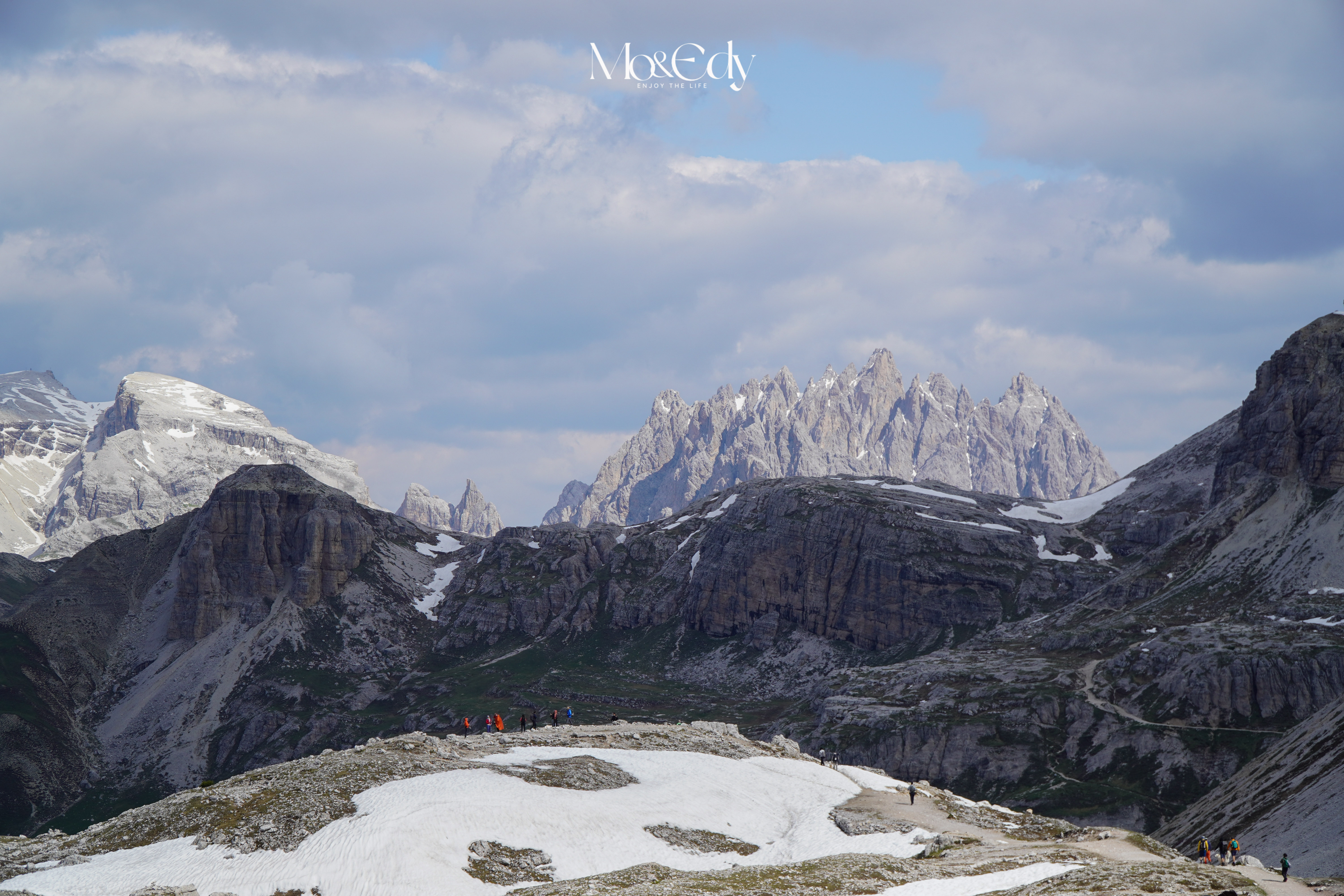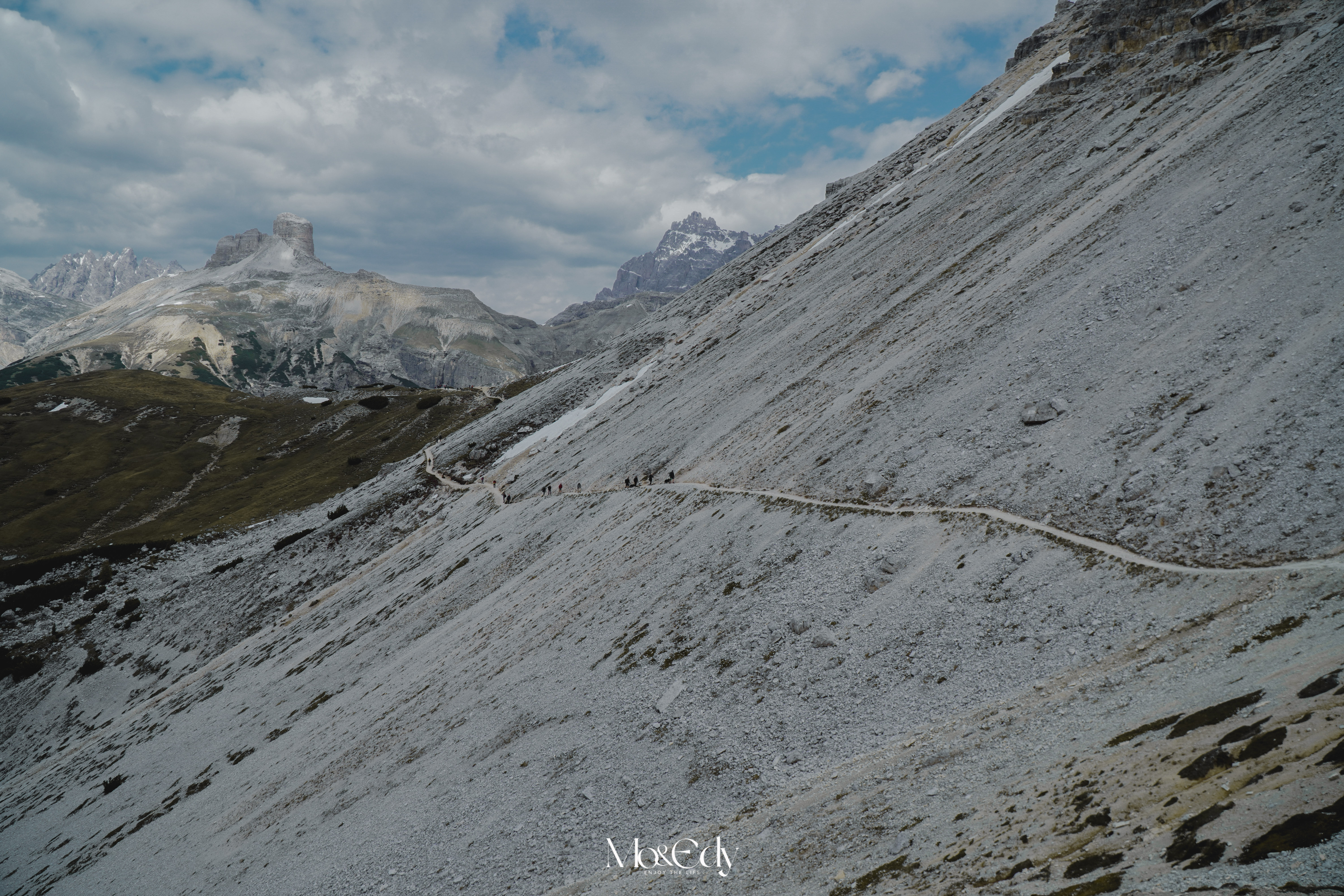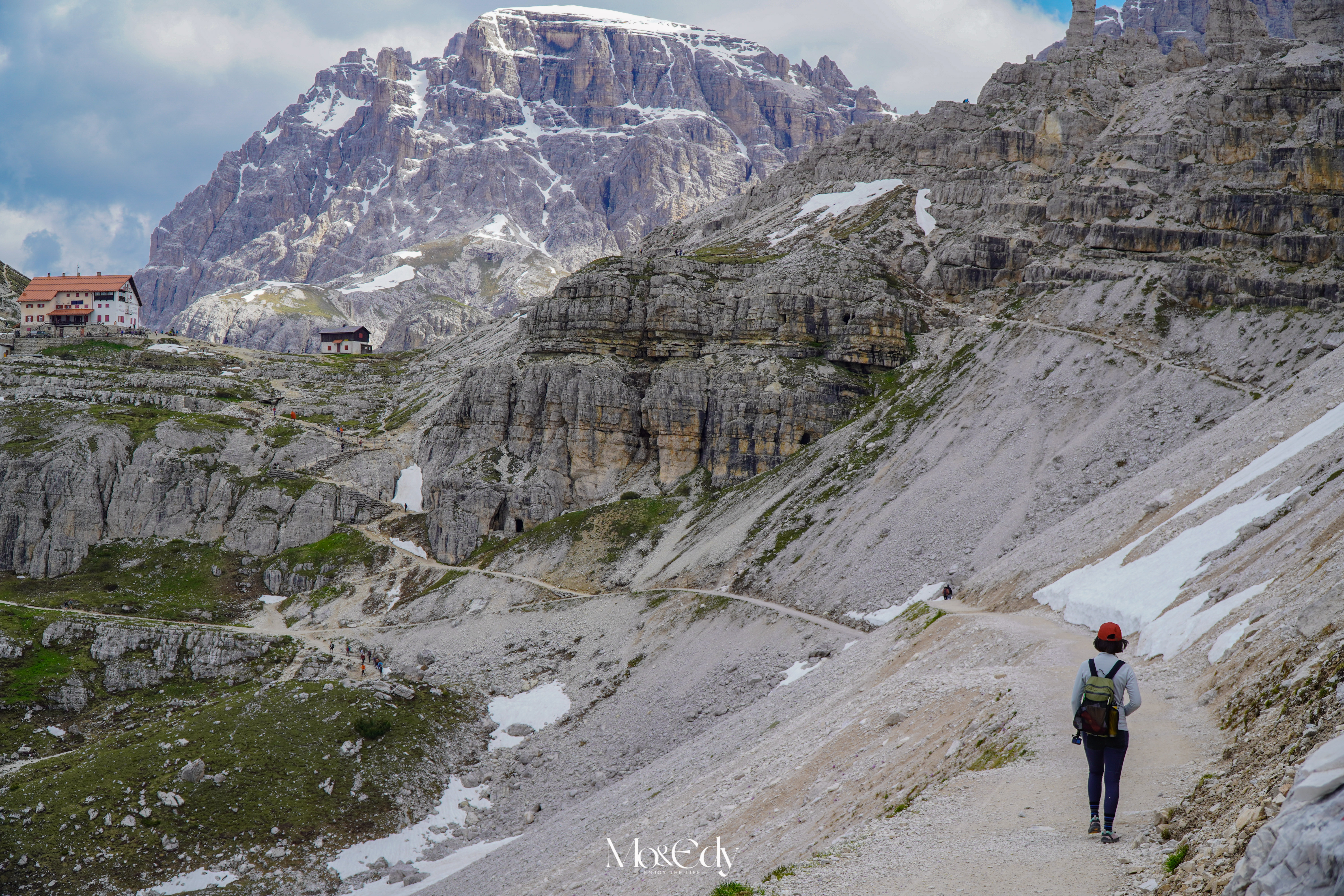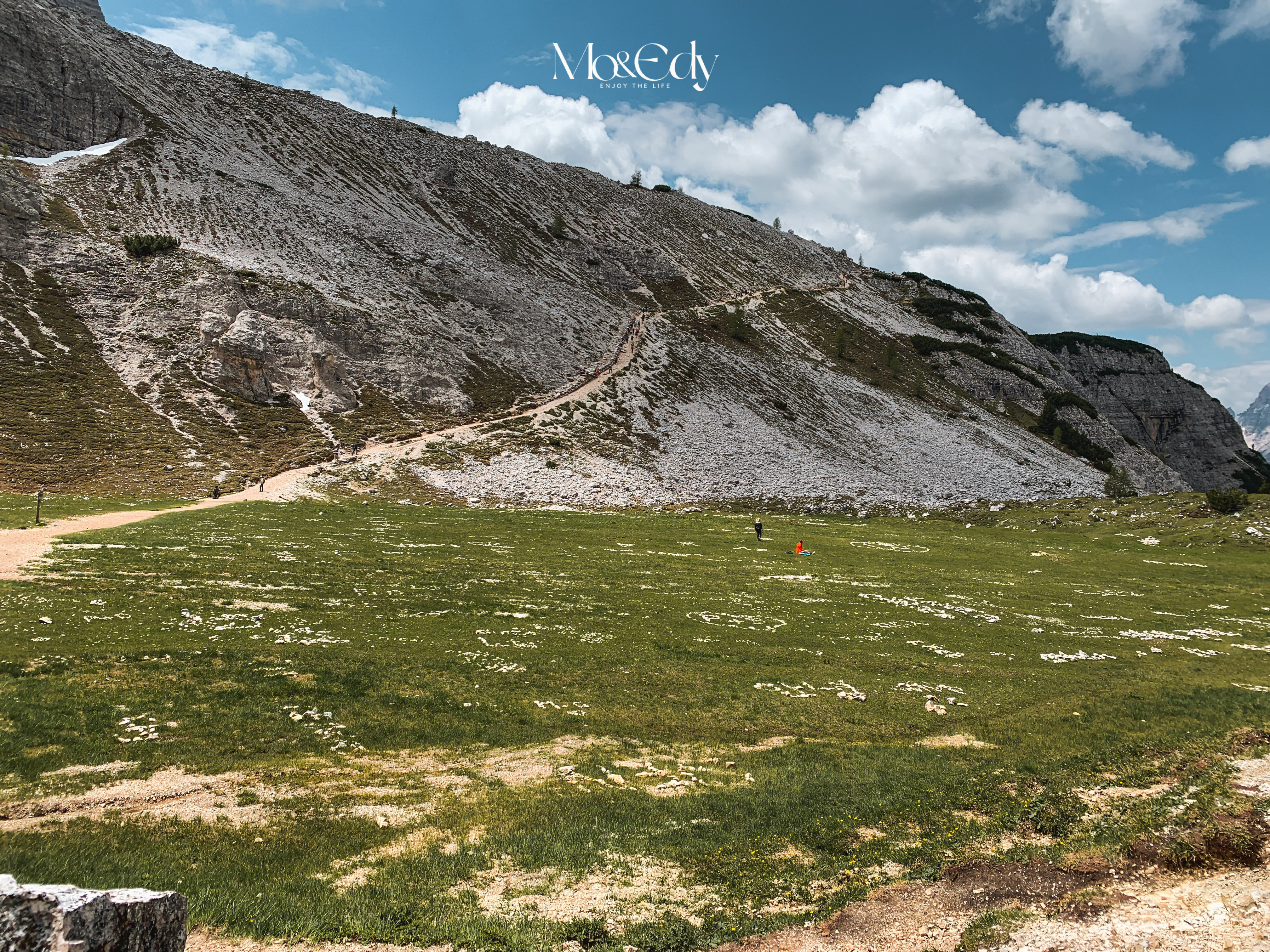 E在行進間時,不斷地尋找IG上有名的洞穴視角。由於我們會時不時地回頭望,推測應該是從Rifugio Locatelli/Drei Zinnen Hütte看過去的視角。同時也在尋找Live攝影機的位置。