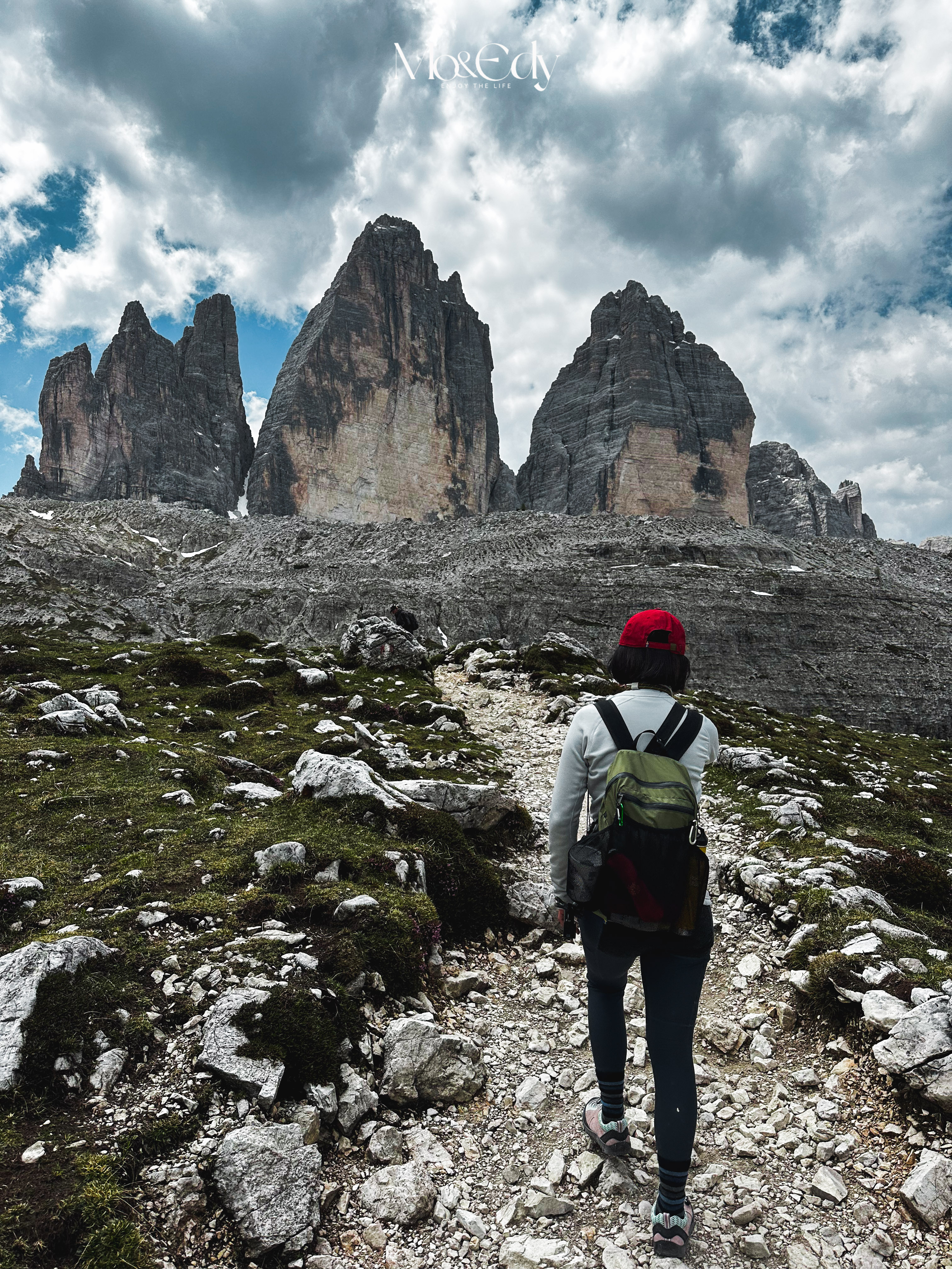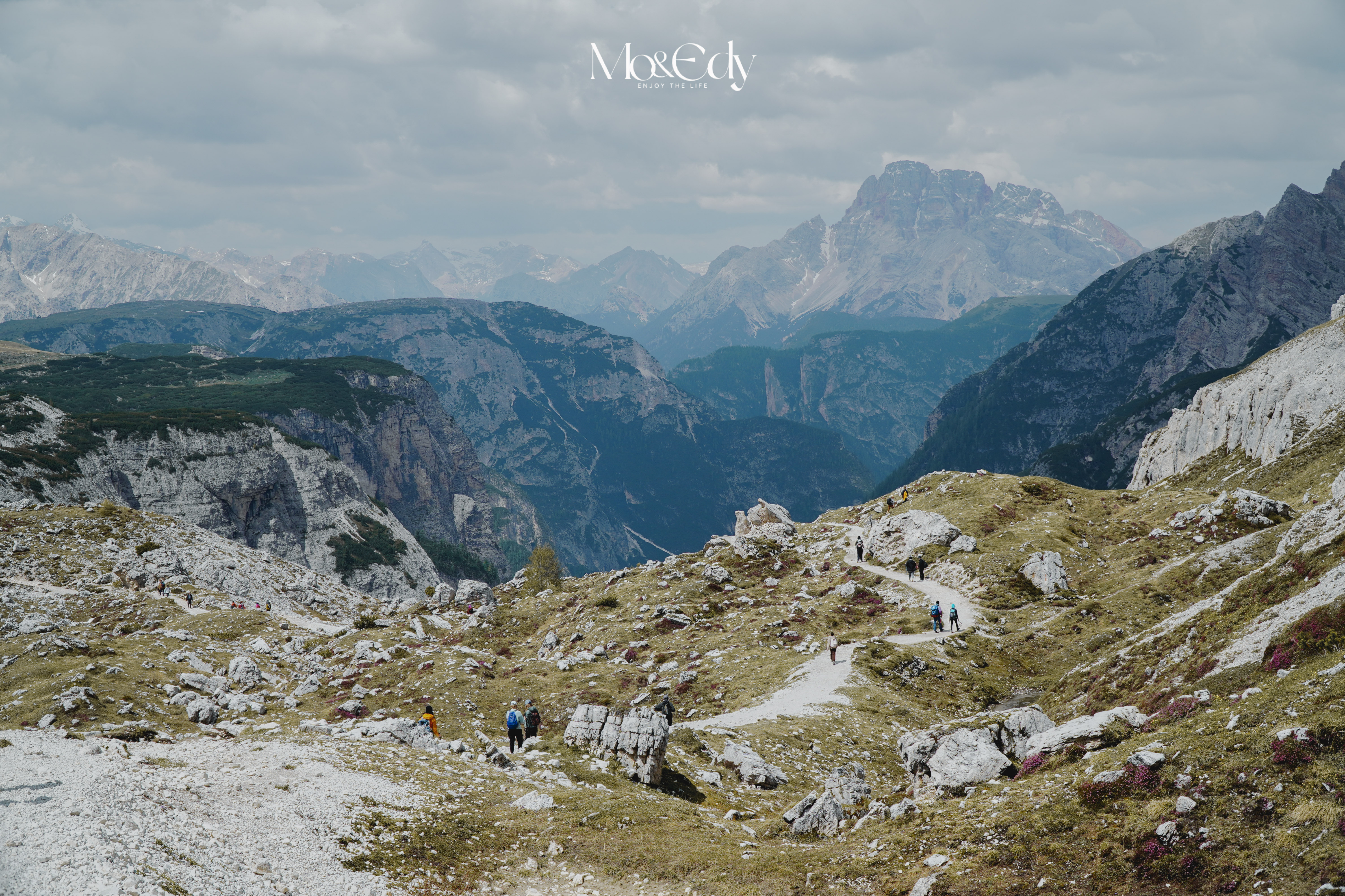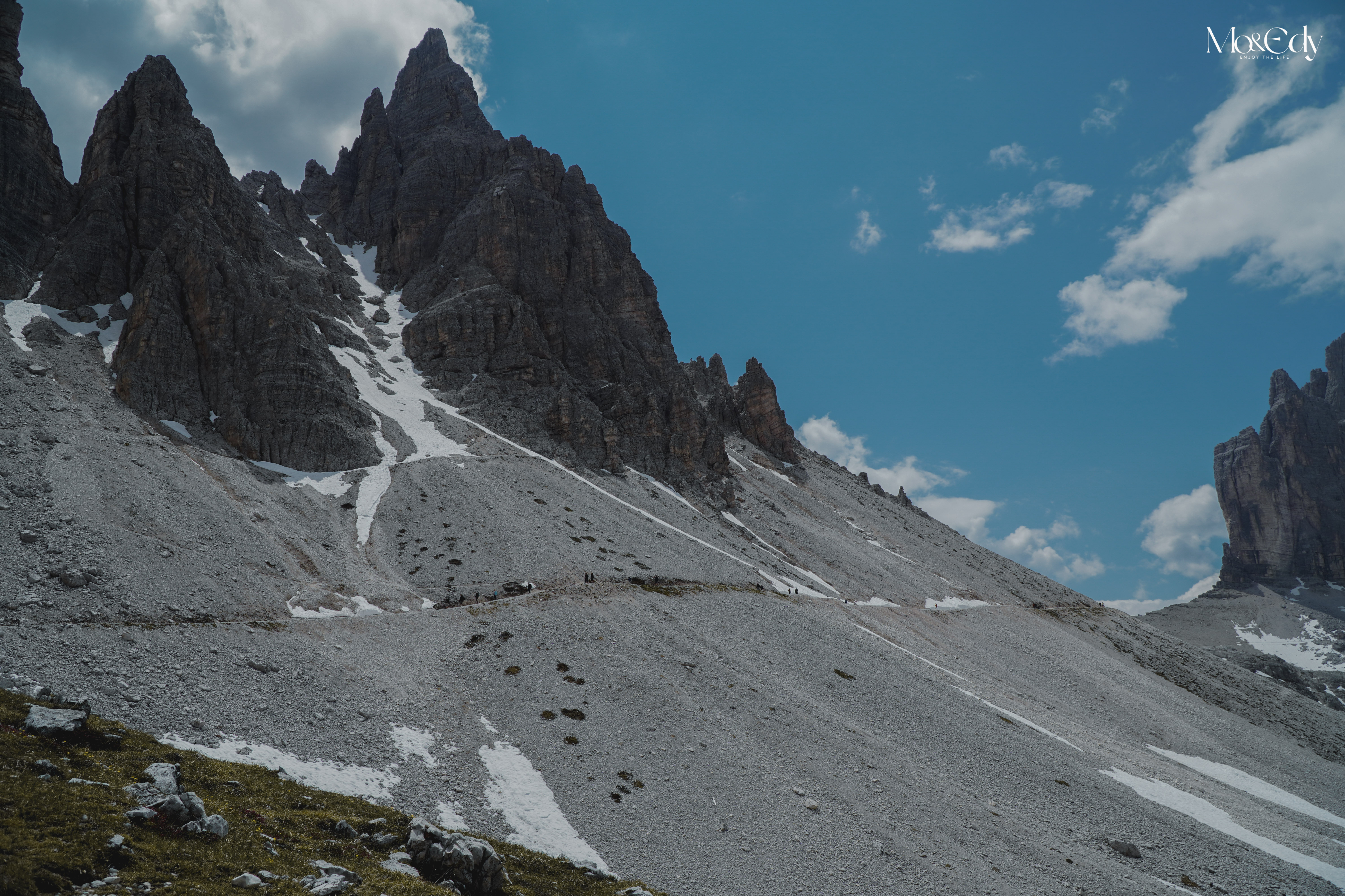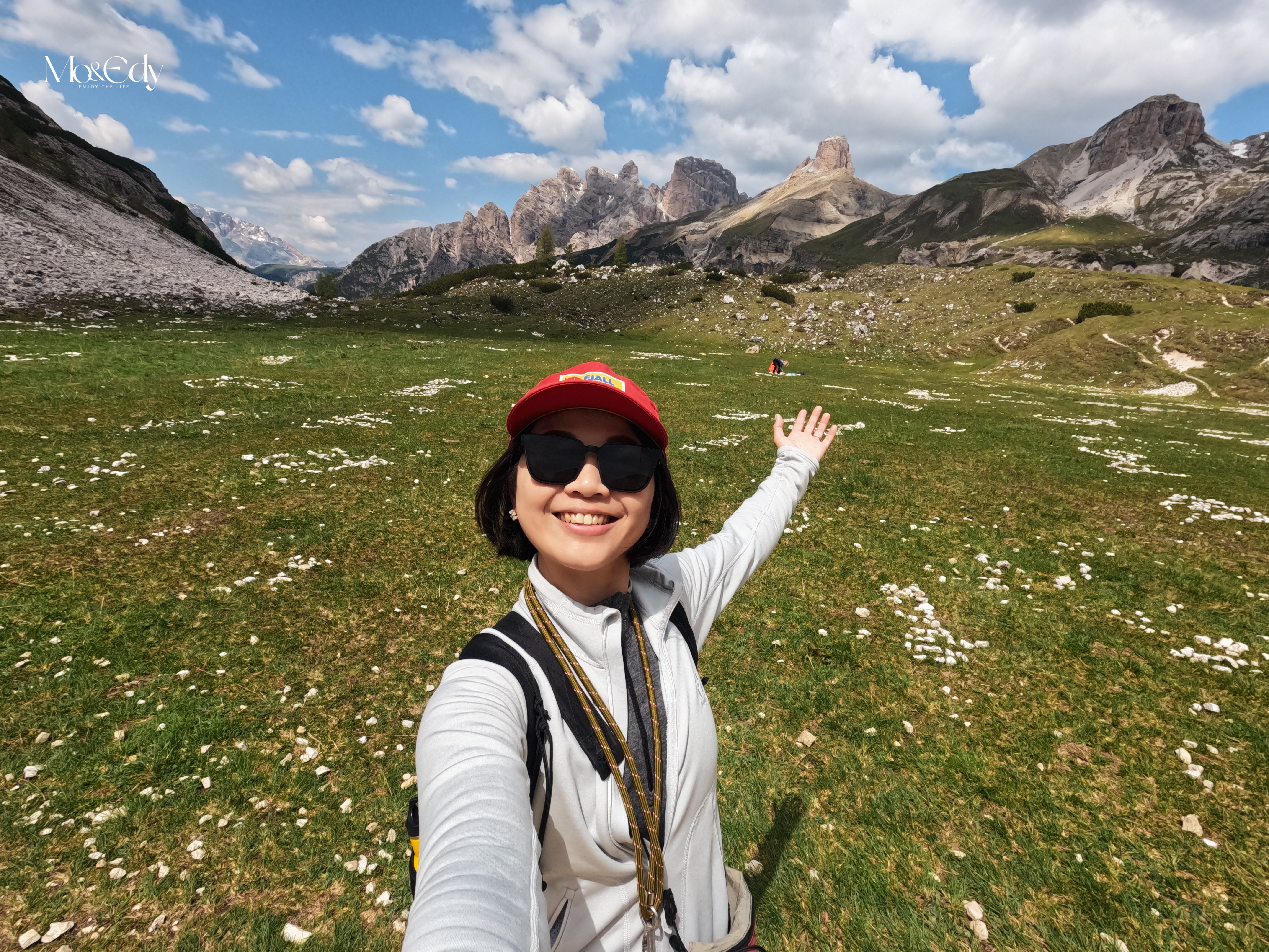 E在行進間時,不斷地尋找IG上有名的洞穴視角。由於我們會時不時地回頭望,推測應該是從Rifugio Locatelli/Drei Zinnen Hütte看過去的視角。同時也在尋找Live攝影機的位置。
