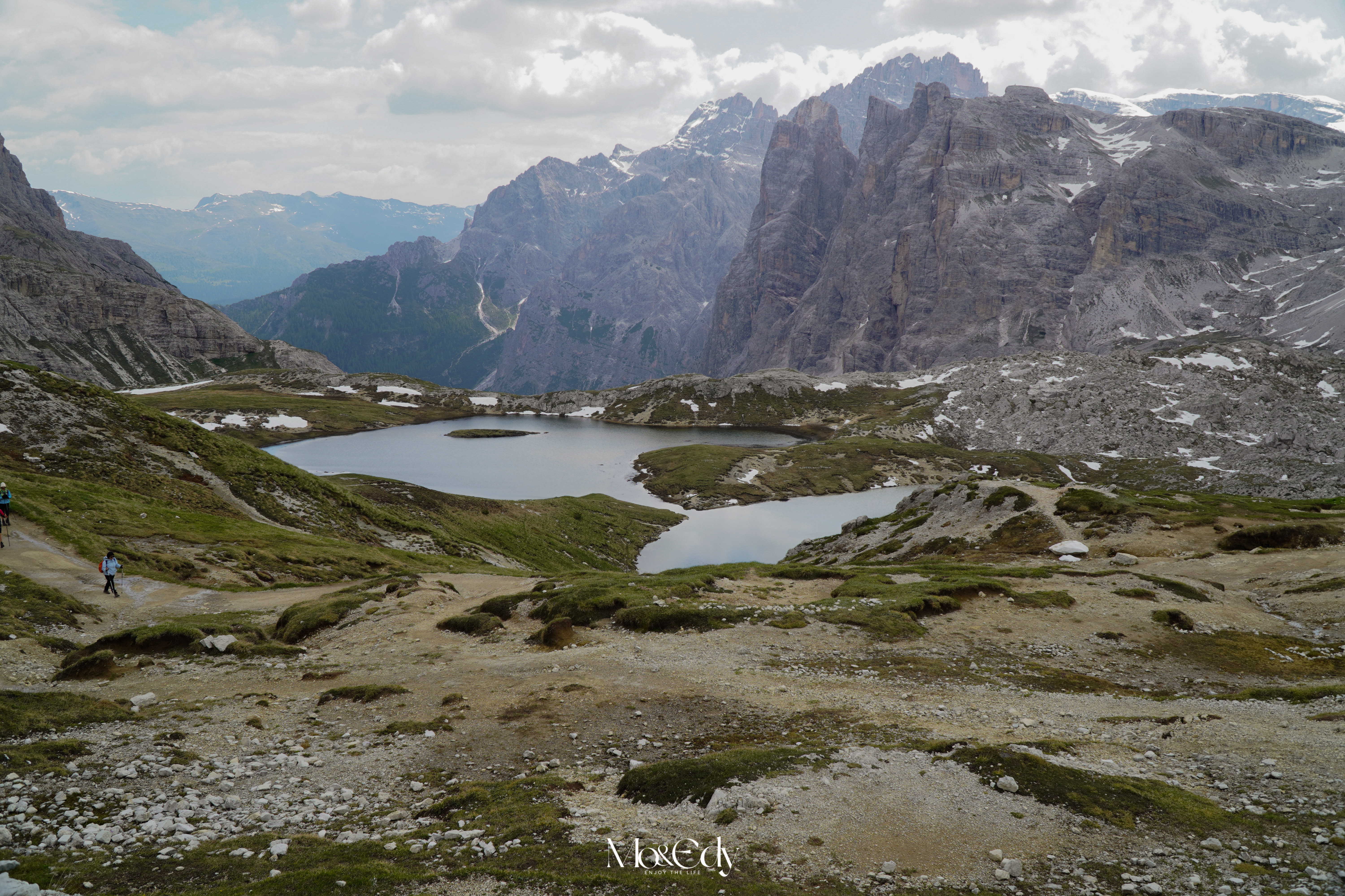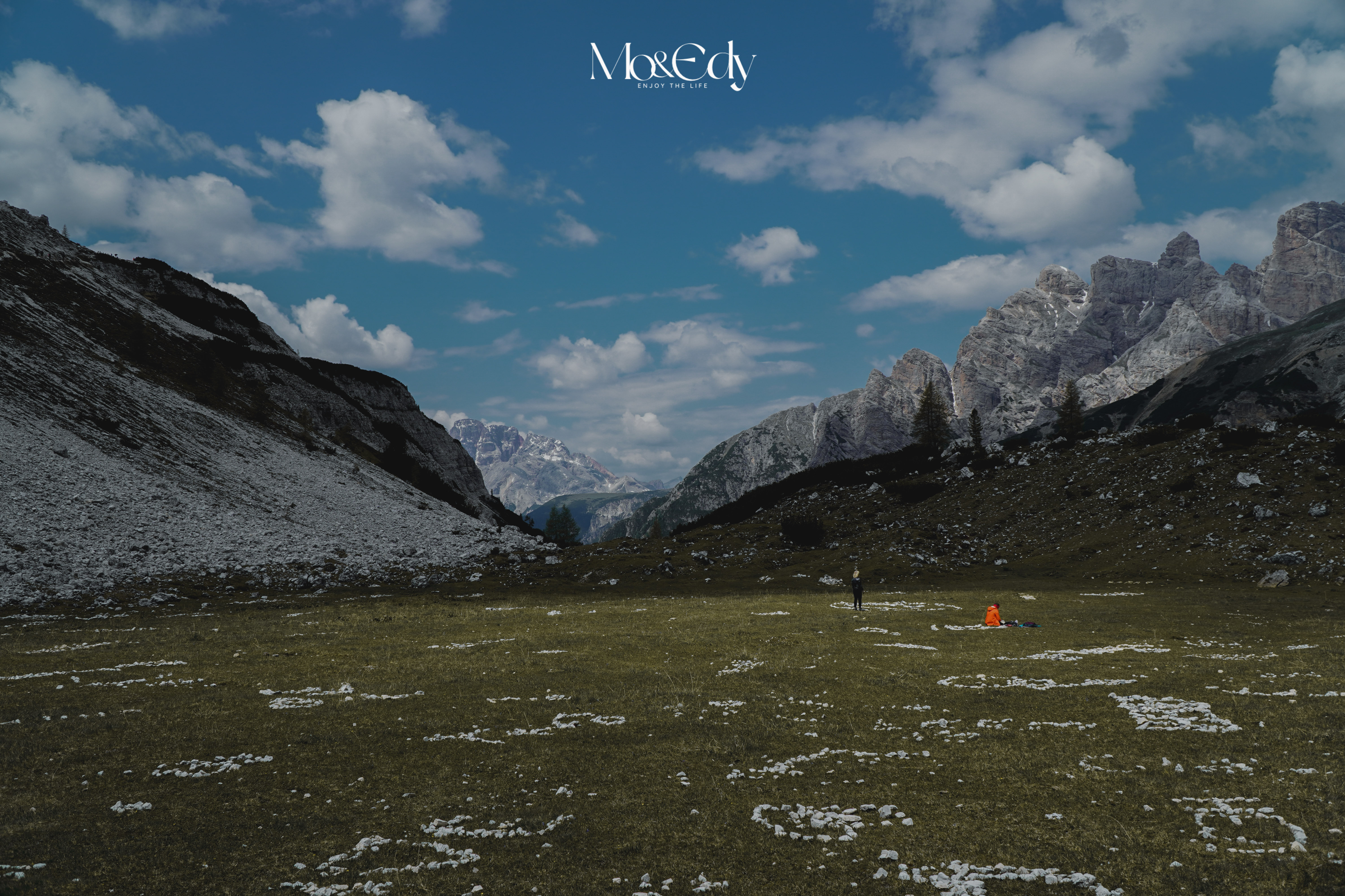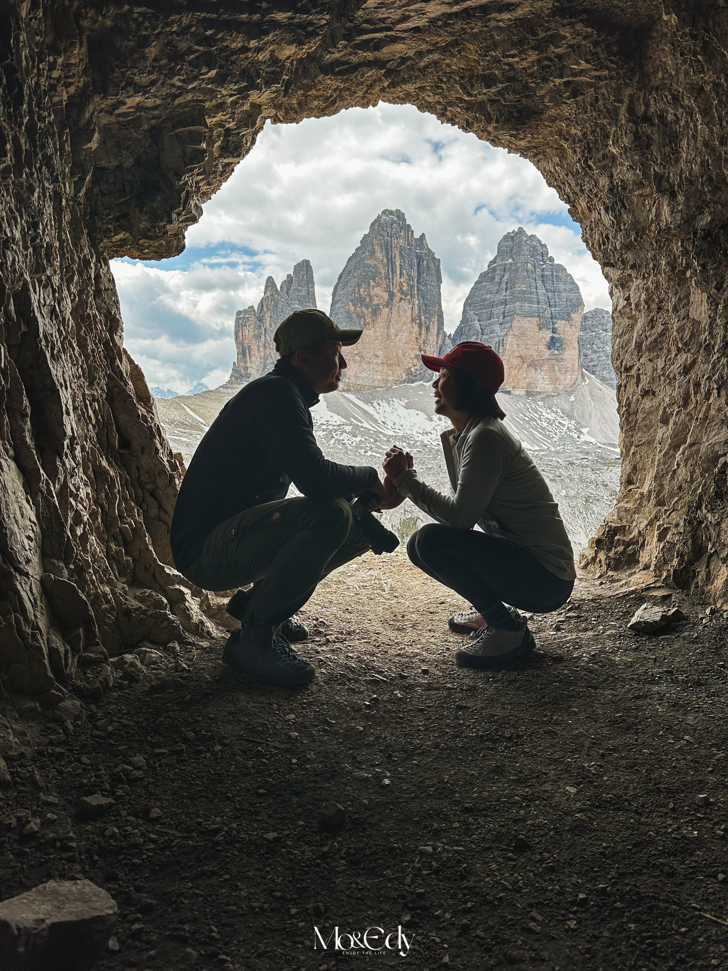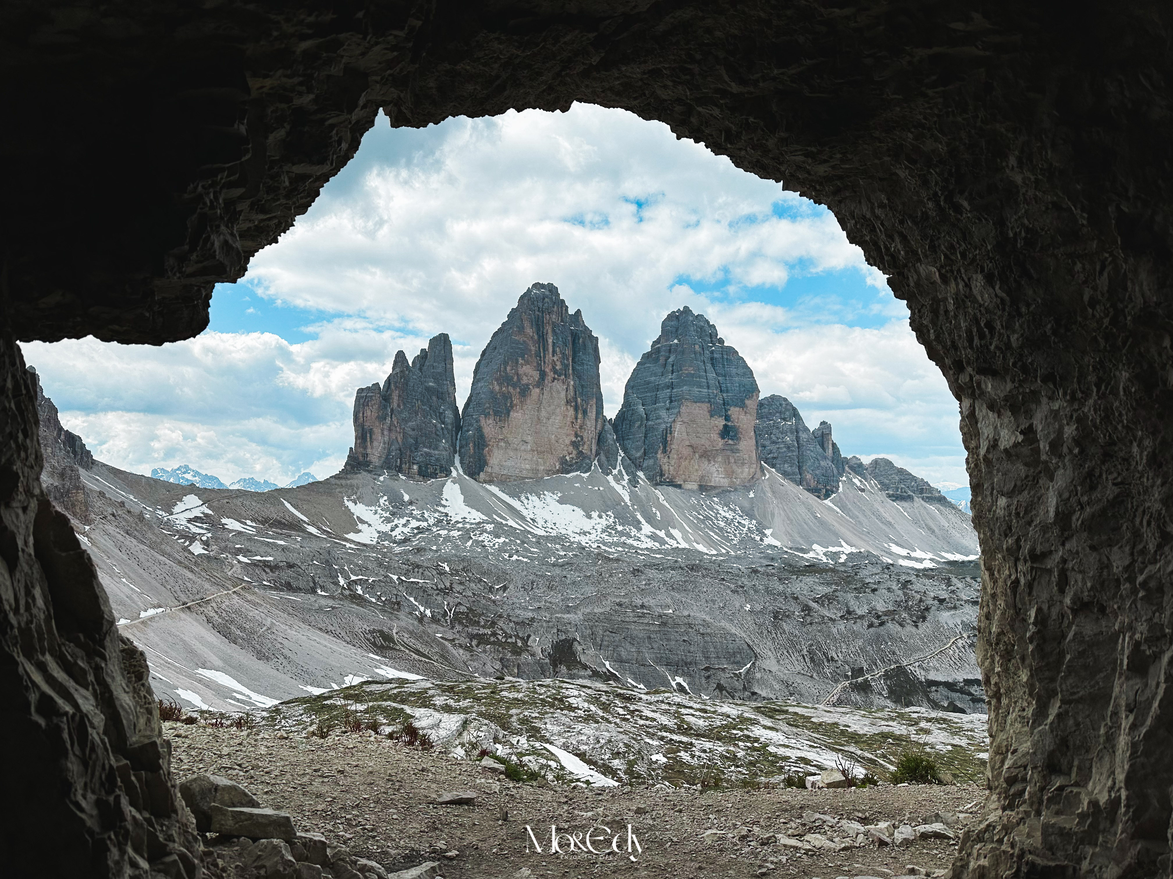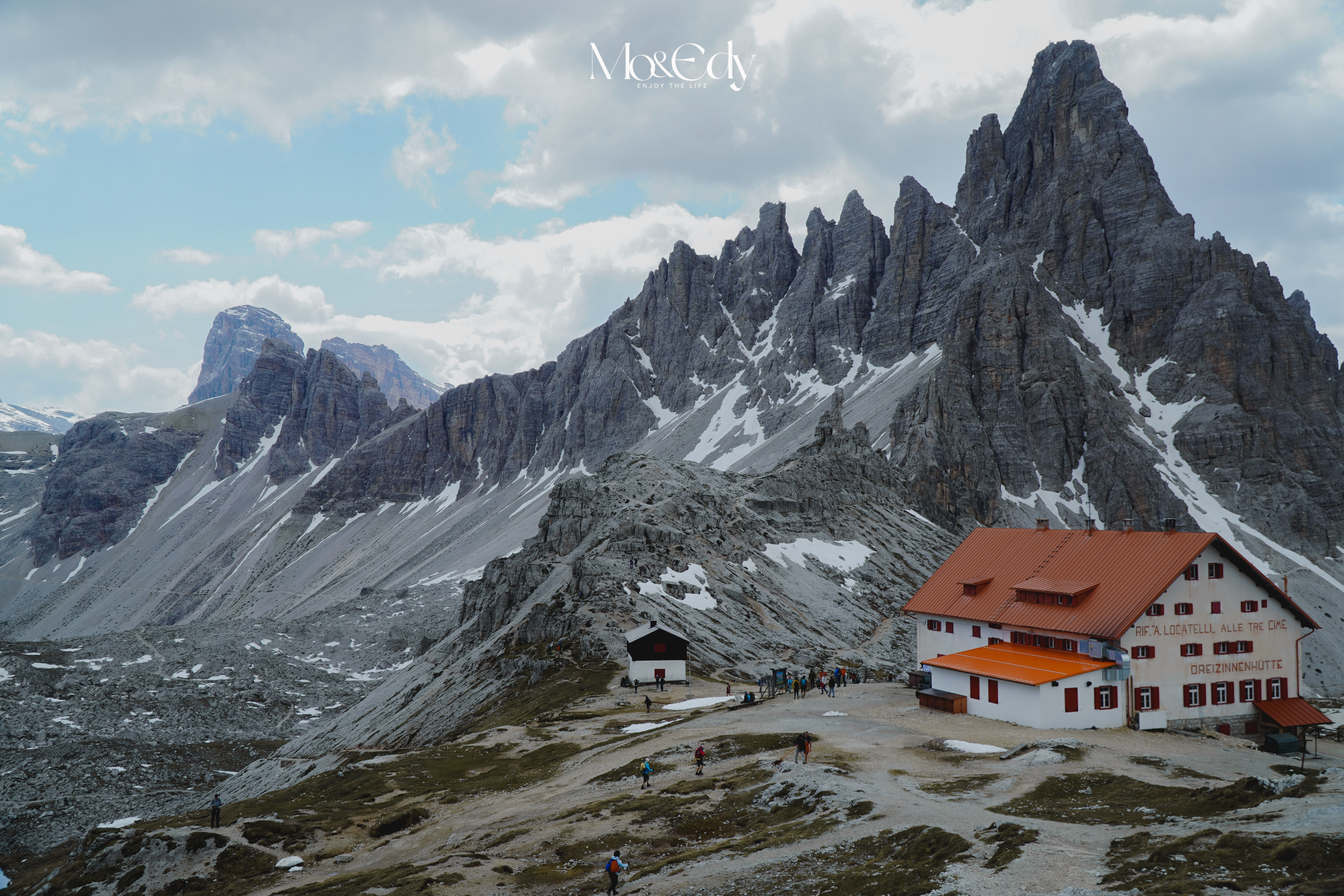E在行進間時,不斷地尋找IG上有名的洞穴視角。由於我們會時不時地回頭望,推測應該是從Rifugio Locatelli/Drei Zinnen Hütte看過去的視角。同時也在尋找Live攝影機的位置。