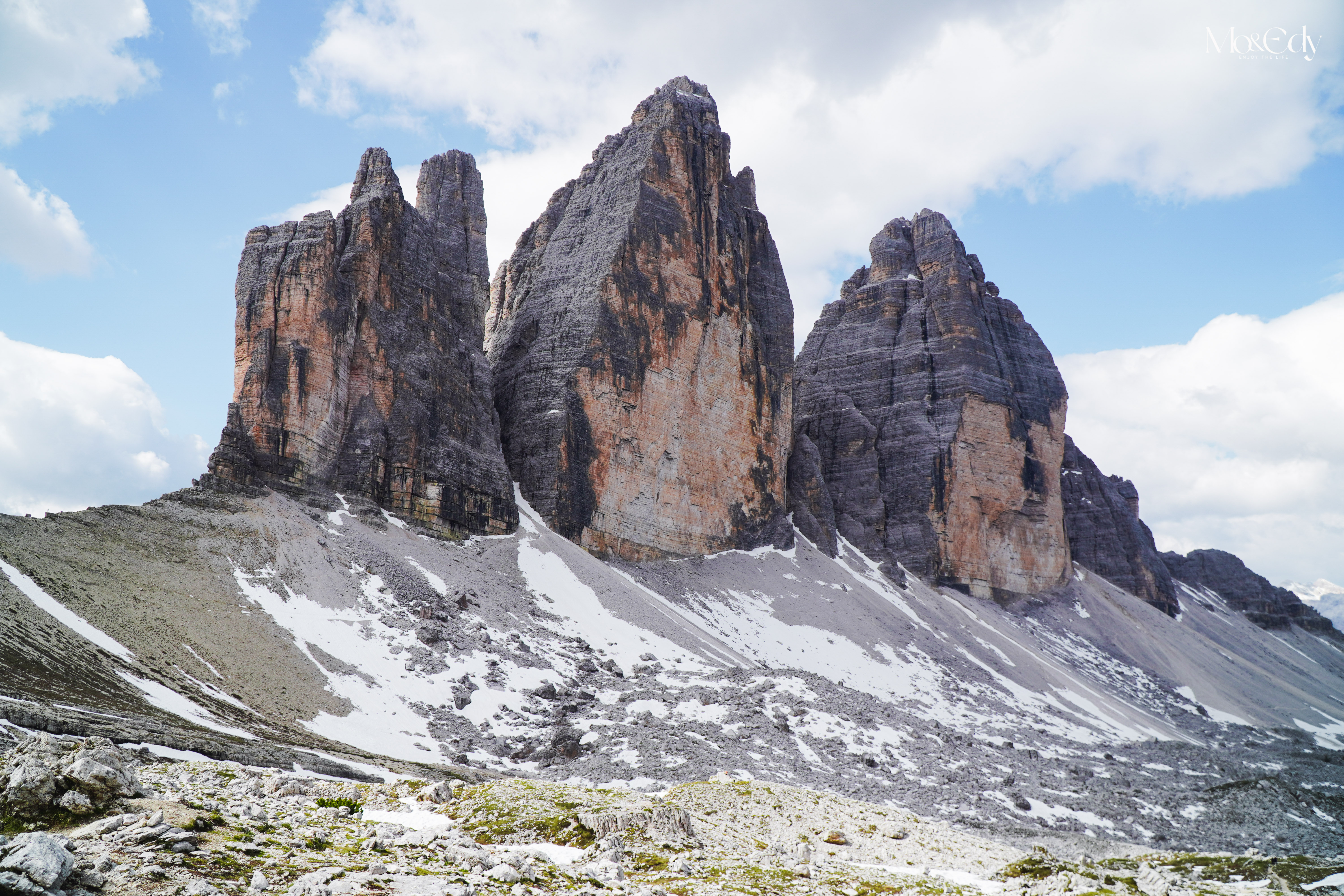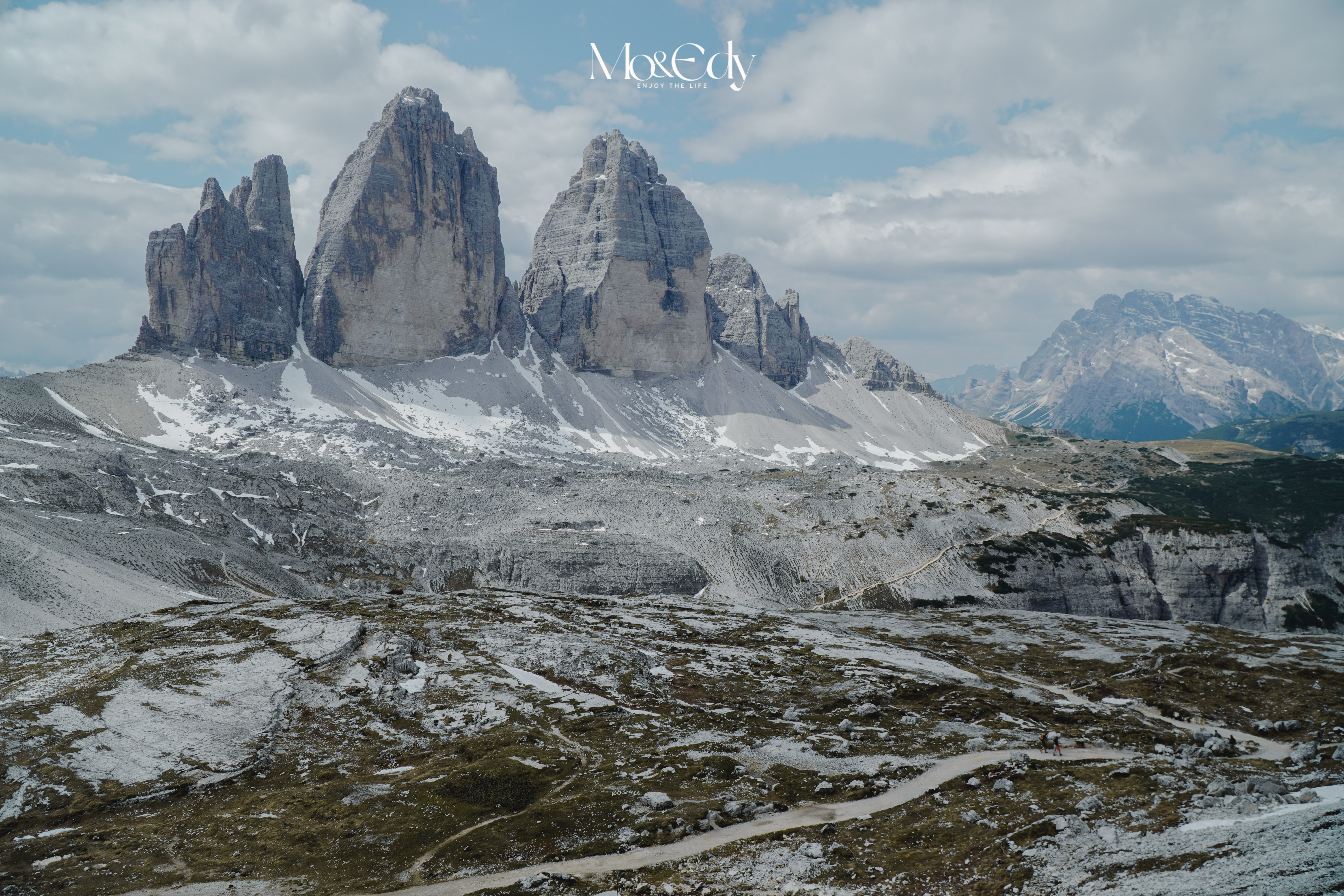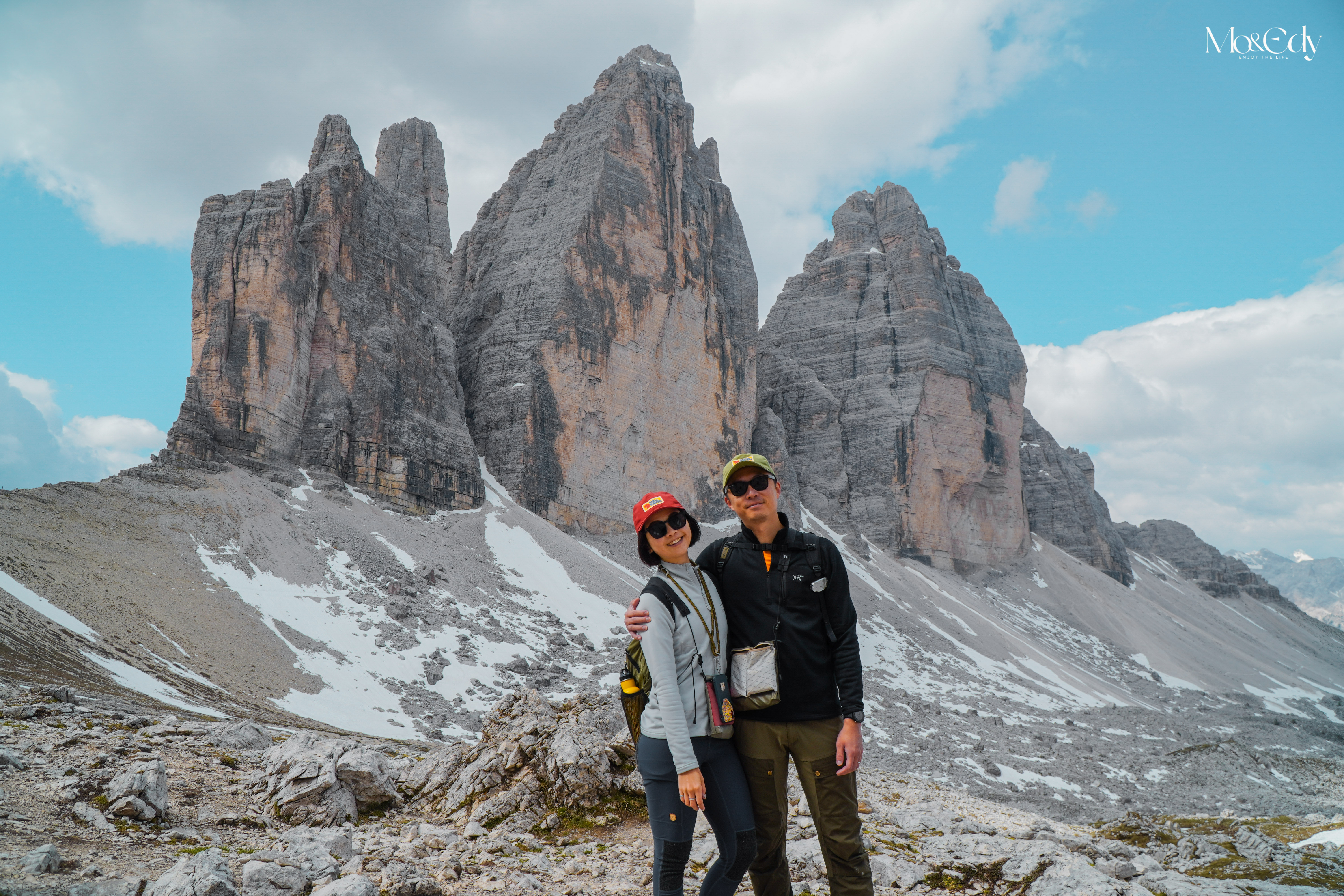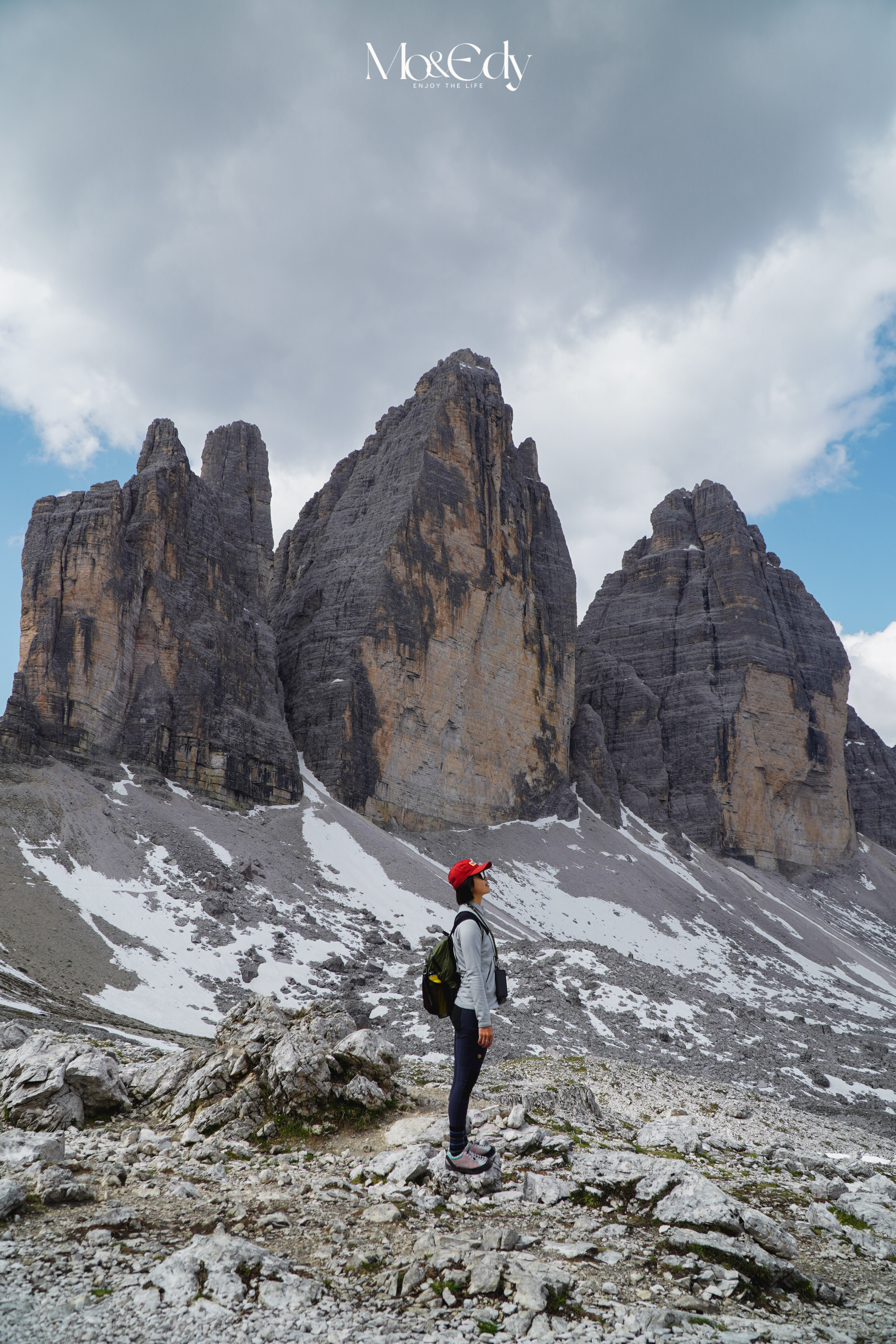 站在Forcella Lavaredo/Paternsattel(拍照點)的地方,三尖峰聳立於眼前,實在很難忽略這巨大的體型。它們的體積大到合影時須保持一定的距離才能將三座尖頭容納至相機畫面裡,這遮天蓋地的體積,彷彿神話中才有的巨人族之雕刻作品。