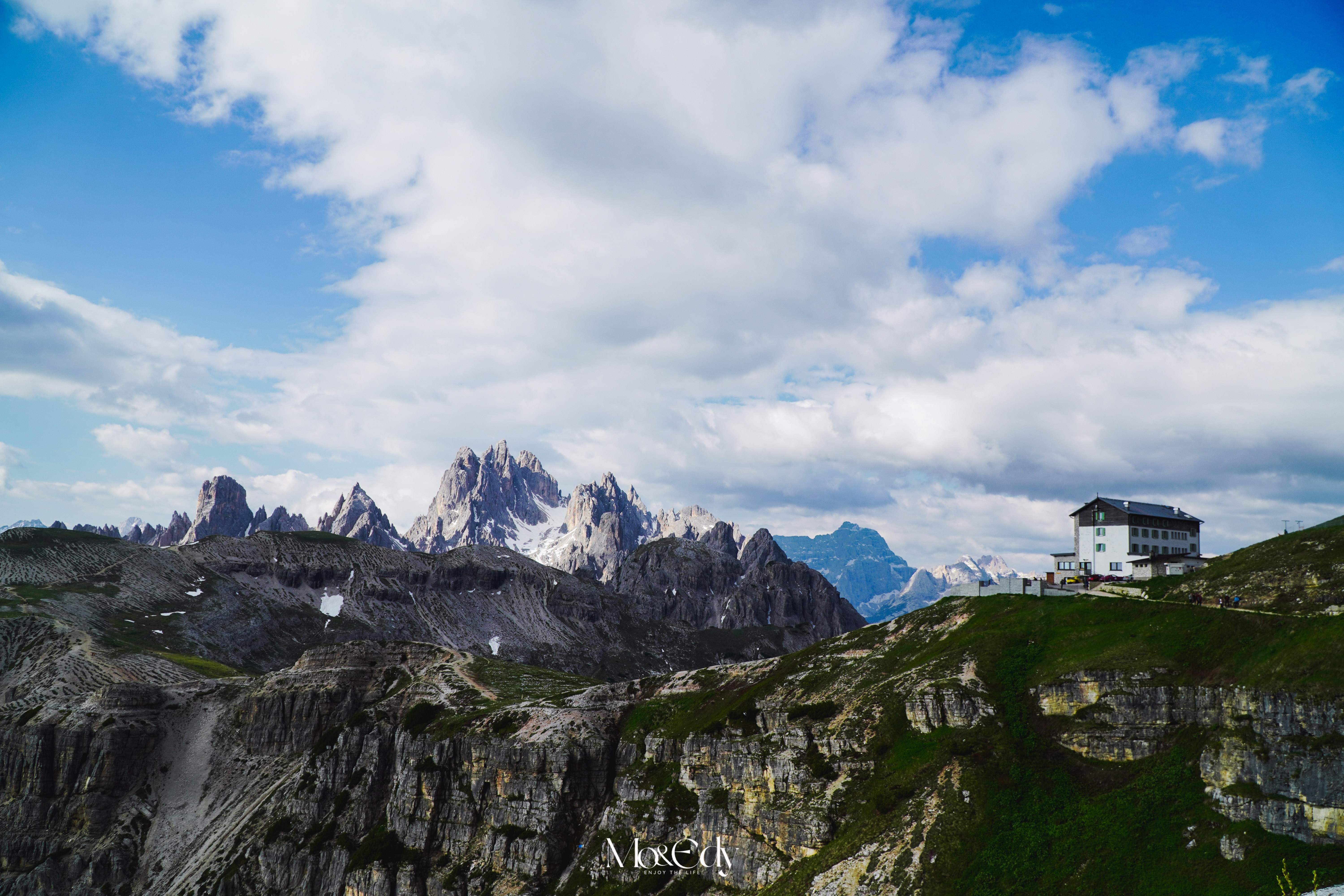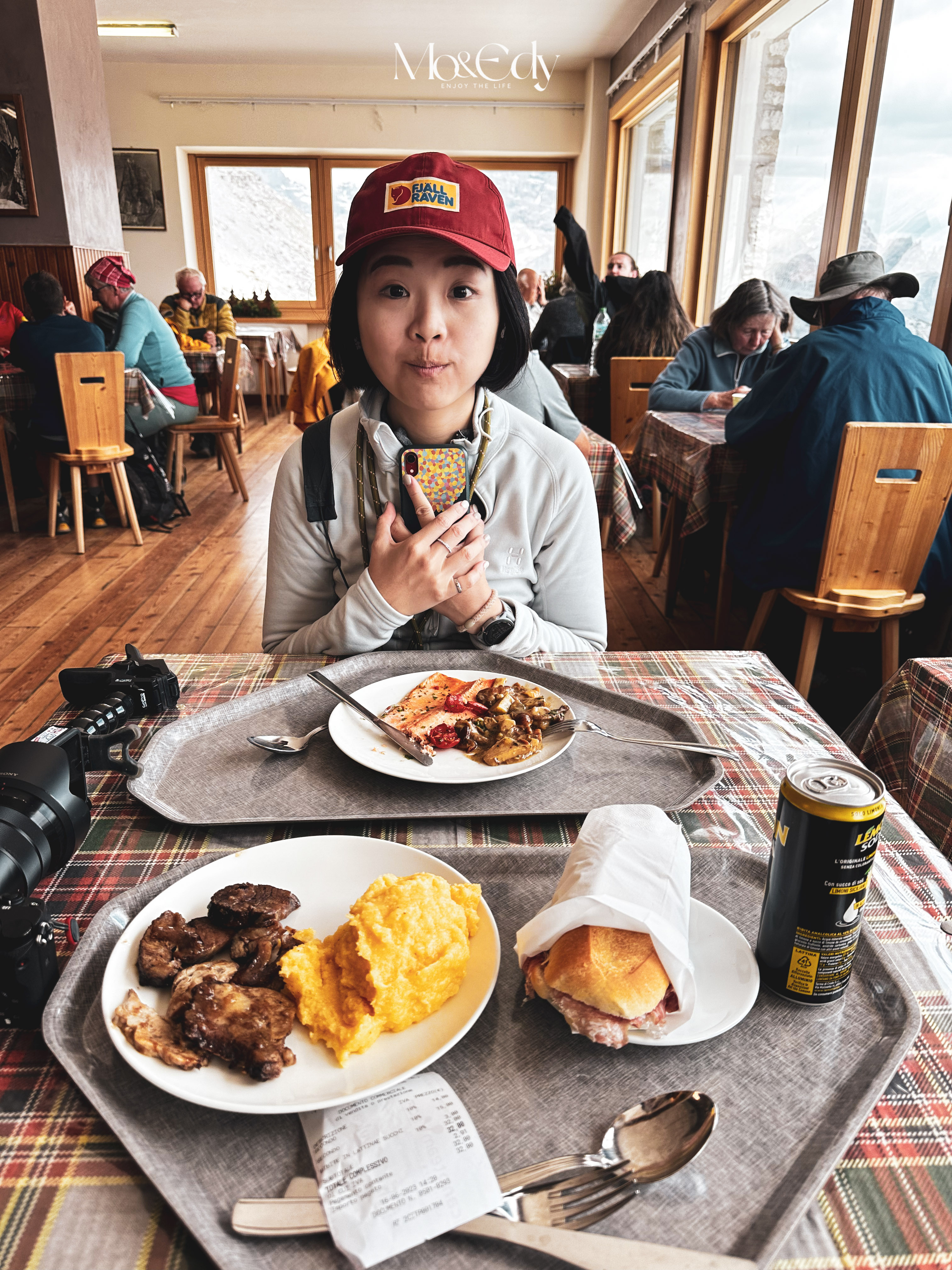 大約下午2點多,我們回到停車場旁的山屋Auronzo。由於兩人都餓壞了,決定在此花錢解決午餐。山屋實在是太高級!我們猜想很多人就算沒健行,開車上山在此山屋停留看風景,也能是美好且浪漫的約會行程!午餐搭配著阿爾卑斯山脈的美景,奢華的生活享受!