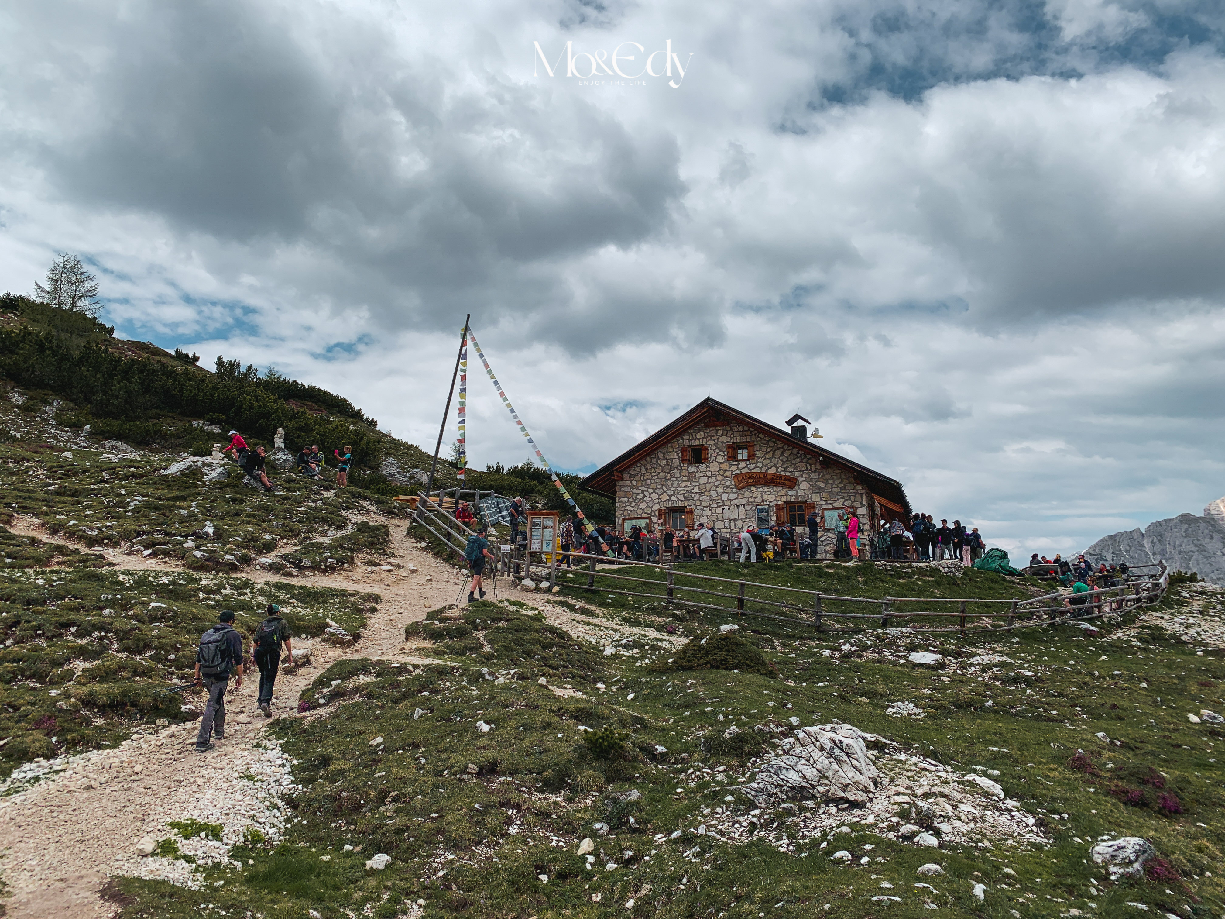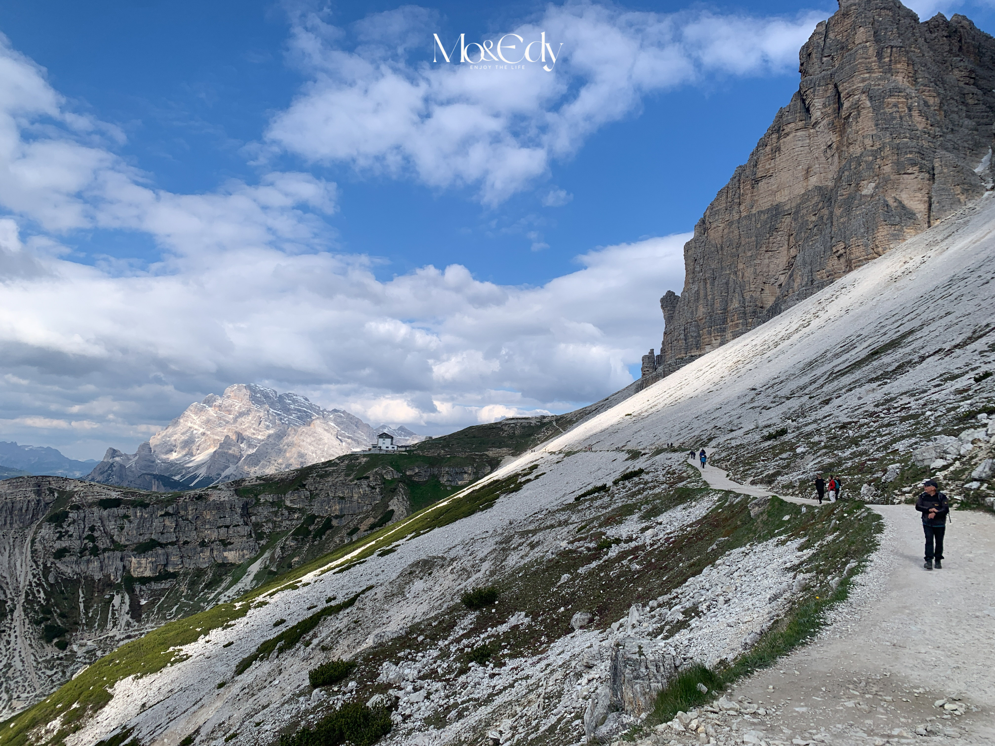 從拍照點離開後,會經過一小段陡峭的下坡,就可以看到Rifugio Locatelli/Drei Zinnen Hütte(山屋)在不遠處的小山丘上。此時大概走了快一個半小時。