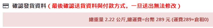 1.我上次買5樣東西,分別勾選不同數量看不同重量運費差多少,還記得1.9X Kg 運費就2xx了(準確數字忘了) 全重2.42Kg NT289 (勾4樣帶電池1.69Kg)
