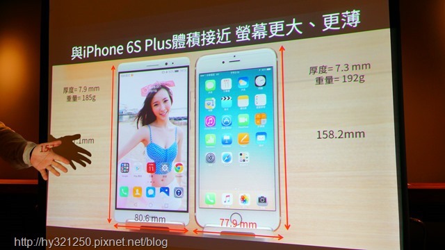 跟iPhone 6S Plus相比,在體積差不多狀況下,Mate 8的螢幕更大,而且更輕。