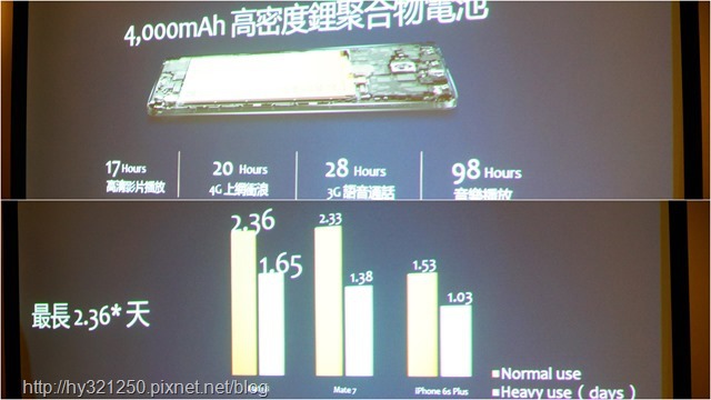 使用4000mAh高密度鋰聚合物電池的Mate 8,一般使用狀況下,電池最長可撐2.36天。如果是重度使用,電池最長也可撐到1.65天。另外,如果以實際觀看10小時6分的線上影片,或是透過Pcmark電力測試測得的10小時15分來看,重度使用者用上一天是沒問題的。