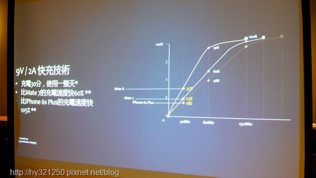 Mate 8隨附支援快充的9V/2A變壓器,充電30分鐘就能讓Mate 8在一般使用狀況下使用一天,而將4000mAh鋰電池100%飽充,也只需要2.5小時。