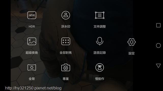 在相片項目下,有HDR、浮水印、文件調整、超級夜晚、全部對焦、語音記錄、全景、專業與慢動作九種預設模式可以選擇使用。