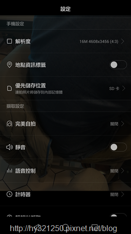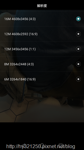 相片項目的設定選項。其中,解析度部分4:3比例最大到4608x3456,16:9比例最大到4608x2592。