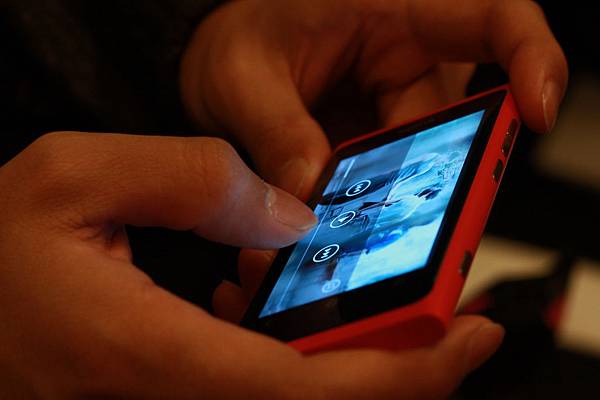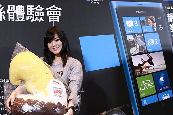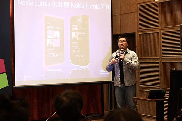 好久不見的品牌經理 Lorenz很認真地在介紹Lumia....此時的宣彤啃著這次活動所贈的芒果乾一邊在試Lumia800的相機