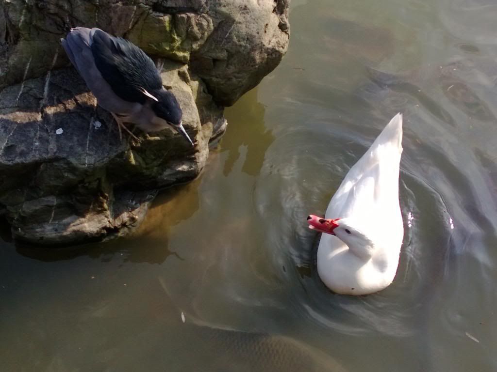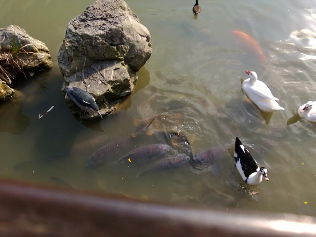 這張是旁邊有個小朋友丟麵包,魚鳥皆搶食的畫面...(台大的魚真的很肥)