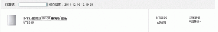 成交日期:2014-12-16 12:13:26紅米Note 4G增強版 8GB 白色NT$4799成交日期:2014-12-16 12:12:12紅米Note 4G增強版 8GB 白色NT$4799付款成功2014-12-1616:19:09配貨2014-12-1618:11:20到現在還再待出庫