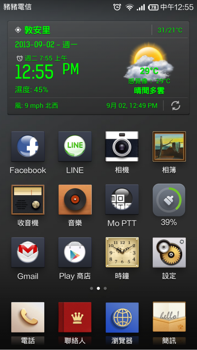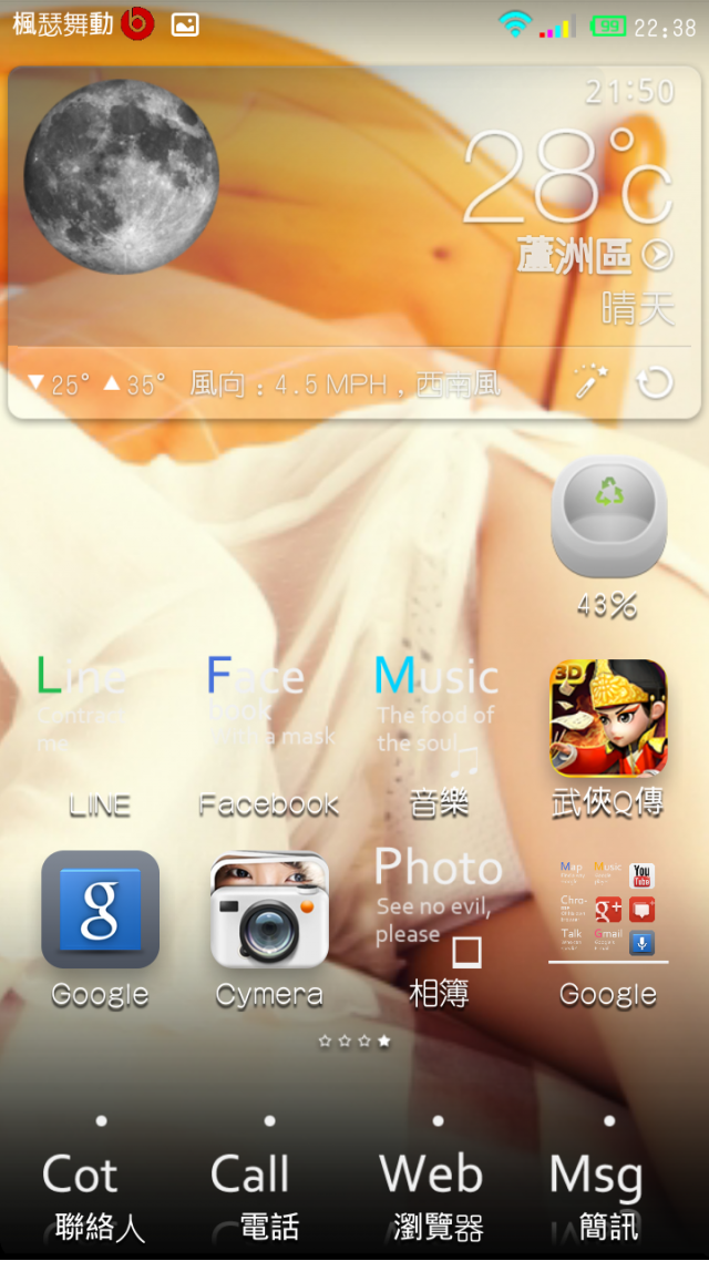 最後我是參考MIUI論壇內有大大分享的方式,下載"Weather BZ",再啟動"MIUI ROMs"他會要求安裝"Weather Dummy",就可以使用囉,只是還是無法像energy大的一樣是主題內建顯示這是我的桌面,這主題應該不少人用吧~很可愛!呵呵