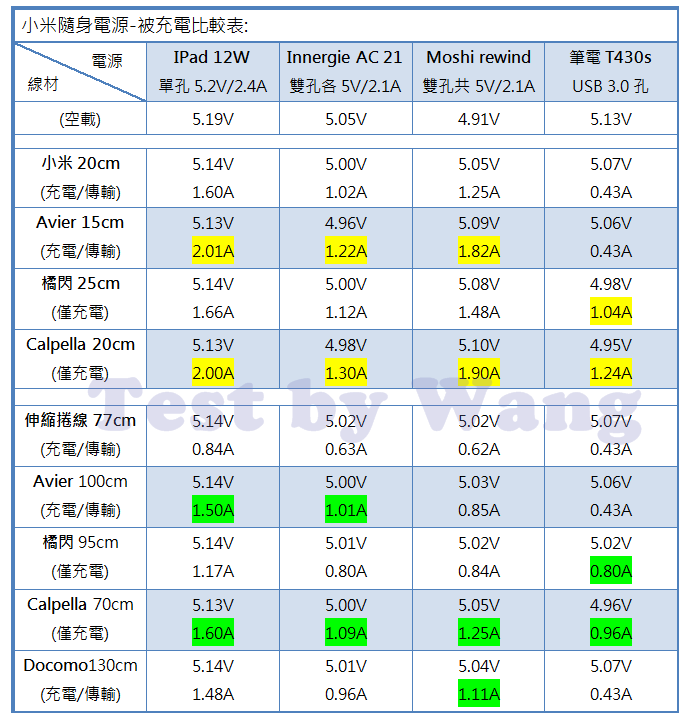 因為經由另外的測試,小米短線、A牌和Docomo不論長或短,配上AC21或是Rewind 充IPad 都能夠在1.95A左右,就連表現最差的捲線都能有1.8A。(Belkin及其他牌無短接線材除捲線外配IPad 12W為2.2A以上),橘閃和C牌因為已短接,充IPad皆無法超過1A,惟小弟亦無可吃2A的他牌平板可交叉測試。