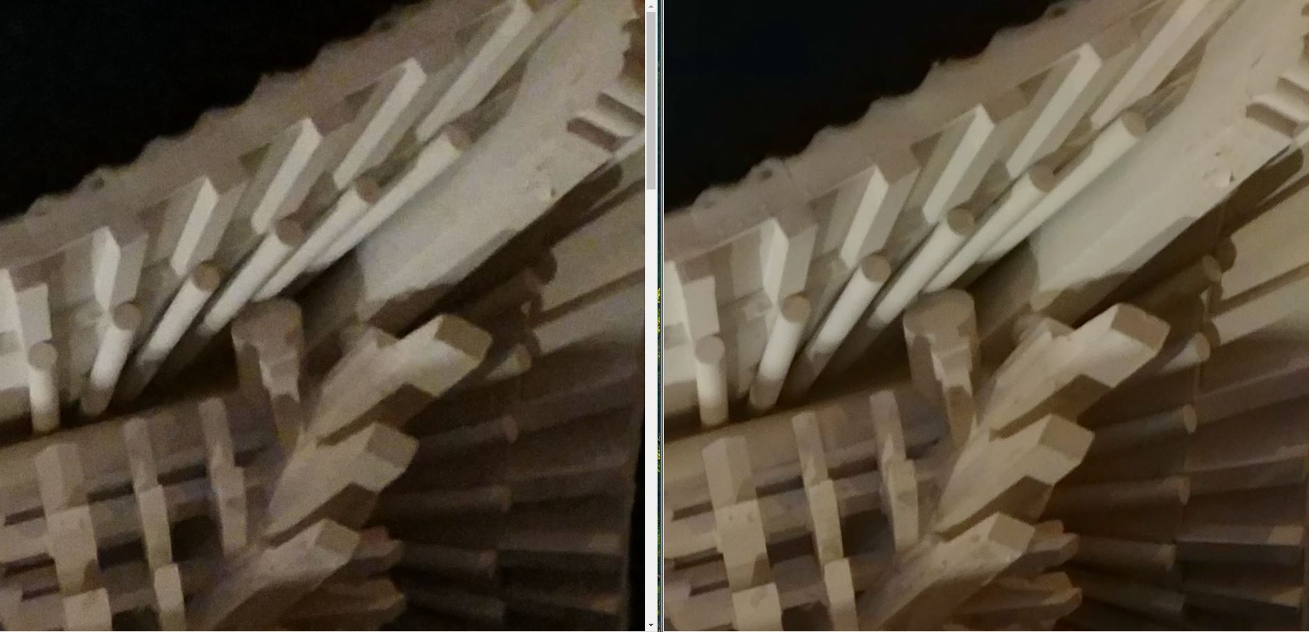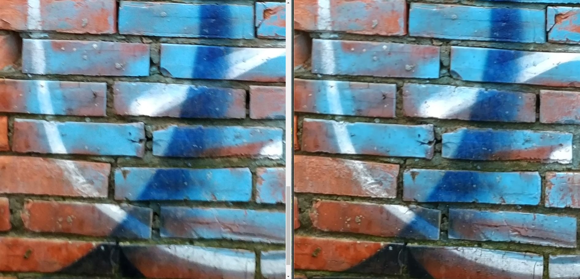 而右邊不僅較少, 還保留了一些可見的細節, 如磚塊間的混泥土, 漆畫的線條.