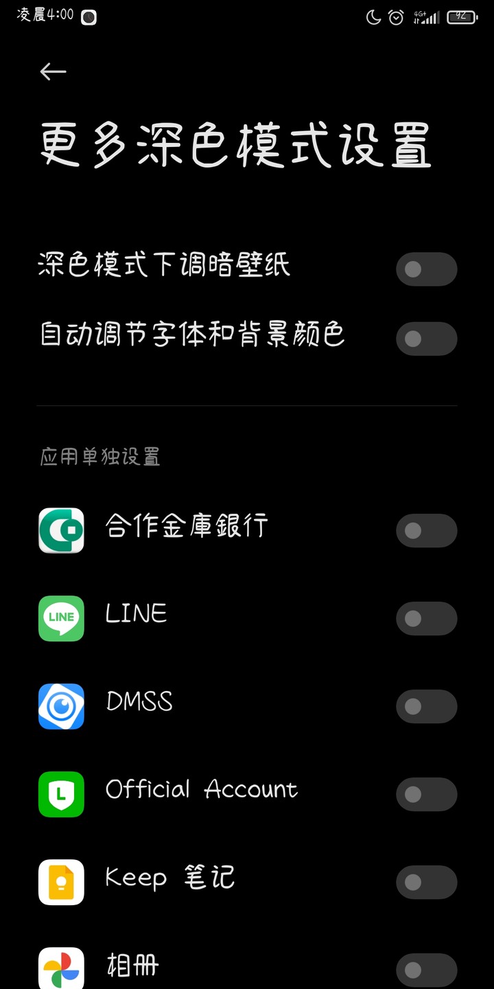 對了回歸正題,這問題是MIUI的BUG已經存在一段時間了,目前處理方法有這問題的APP關掉該應用的深色模式回復淺色模式可解決白色過淺的問題