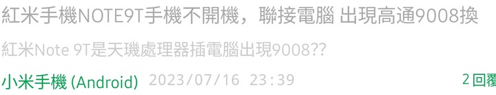 小米手機(陸版名稱紅米手機NOTE9)手機不開機(台灣版名稱紅米9T),聯電腦高通9008模式,主板維修技巧。原因CPU或控制功放供電IC 虛焊了(手機過熱,脫焊了),我是直接的用熱風槍 吹 350度 去哄 一下Cpu 功放供電IC 的 白色金屬片。不到一分鐘,冷卻後就裝回去 手機 組好,就能開機了。維修技術來源谷歌搜尋。