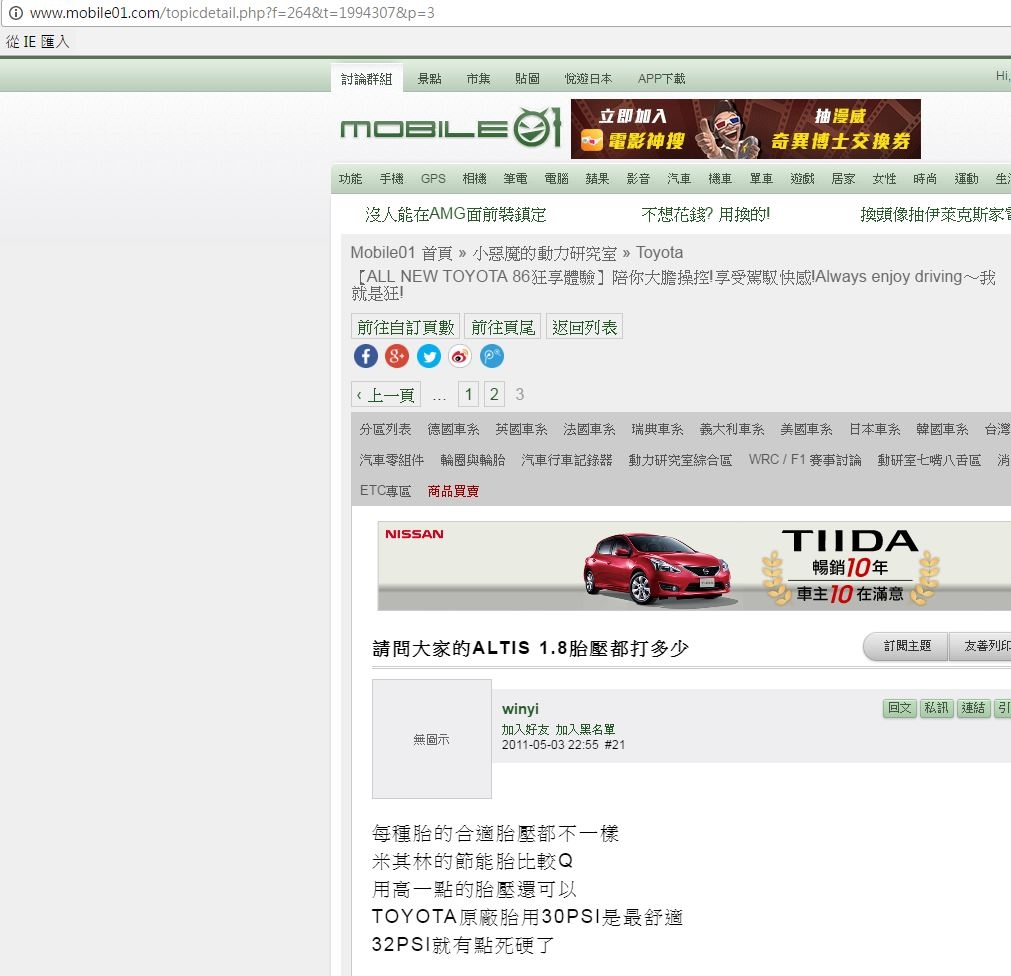 ORO_TPMS wrote:>不要前後輪胎壓差太多是沒關係的...(恕刪) 感謝解答,我夏天是早上冷車時,前34後32,冬天應該會打前36後34,應該都比原廠建議值高,偶數比較好對自己買的胎壓計刻度!如果沒問題的話我就繼續保持下去囉,我的車門打開找不到胎壓建議值,使用手冊也不知放哪裡了,所以上網查,這篇剛好完全符合我的狀況,車款一樣,換胎也換了米其林節能胎,輪胎行老闆也說米其林胎比較Q,胎壓應該要比原廠胎的建議值高才適合。我直接用擷圖囉,有保留網址出處應該可以吧?感謝大家幫我解答疑惑