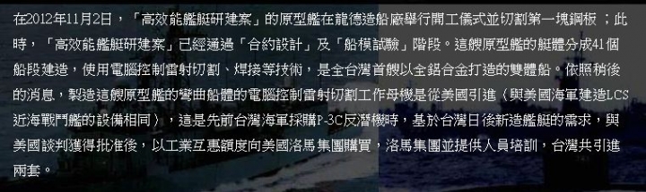 Charlie2020 wrote:比起對岸吹牛能力!...(恕刪) 台灣沱江艦曲船體的電腦控制雷射切割工作母機是從美國洛馬集團購買洛馬集團並提供人員培訓,台灣共引進兩套。船模實驗是在荷蘭做的噴水推進器是從瑞典Marine Jet Power引進柴油主機是從德國MTU進口這艘核心裝備都是從國外搞來的沱江艦,成軍不到半年就出現性能衰退的情形首先就是浮力不足,台灣海軍先減少反艦導彈的裝備數量,並調整導彈發射箱的位置進行反覆試驗後,並沒有明顯改善狀況事實上沱江軍艦即使在沒有裝備 導彈 油 水空載的前提下仍呈現浮力不足的狀態而航速低於設計目標值38節許多,滿載的情況下最高航速只能達到24節在美國人幫忙下台灣人造了一艘汪洋中破船,成軍不到半年就出現性能衰退又何來台灣的軍事工業4.0有多厲害?