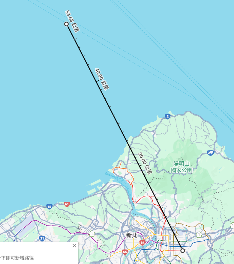 和这个UP主推算的距离其实就差不多了,101到淡水渔人码头西北角的直线距离也是24km左右。再往外就是10公里(5-6海里)出头。