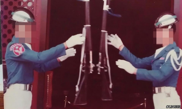 民國49年的陸海空軍儀隊還是使用三零步槍,唯有左營陸戰儀隊從一成立就是使用M1。附一張早期的空儀(舊式禮服,臉部馬賽克處理)駐防於忠烈祠照片,此照據我所知是在民國70年以前,照片很清楚拍到禮槍為三零步槍