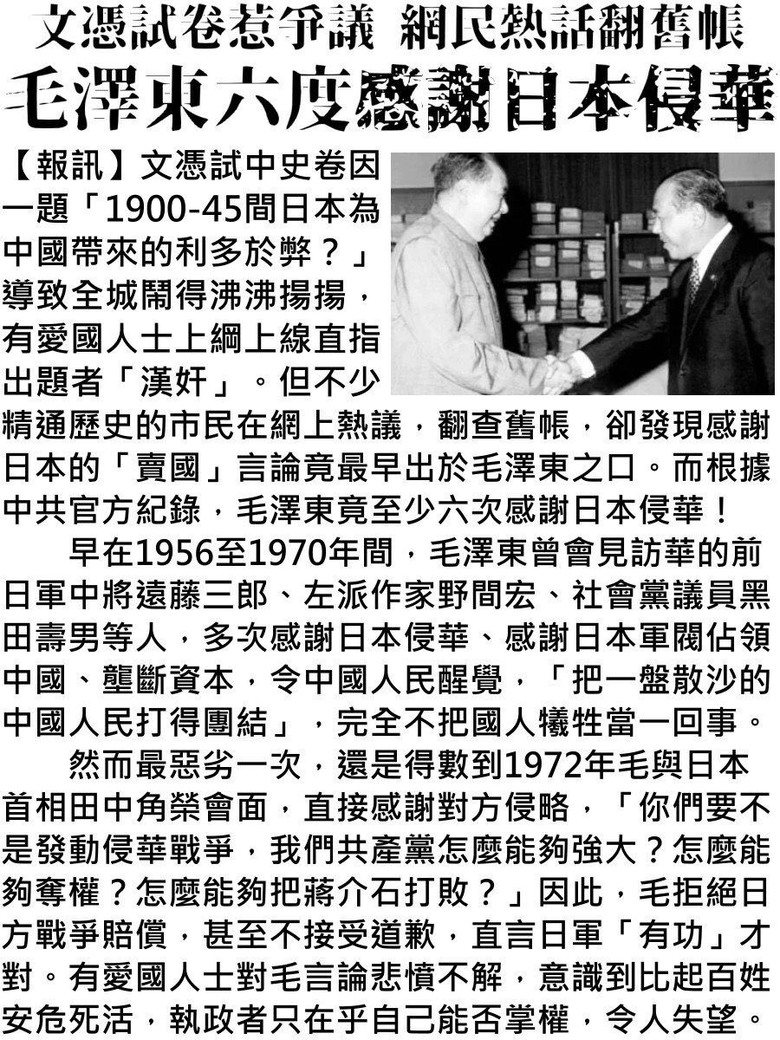 jsyan wrote:欲亡其國,先滅其史。假的東西講久了,就可以開始混淆認知,更可以透過教育手段,改變認知。早年日本改教科書,從侵略亞洲各國改為進出,就可以知其一二。很多似是而非的東西,就靠1450出來洗了⋯⋯ 民進黨也是這麼搞,大家同意嗎? 欲亡其國,先滅其史。