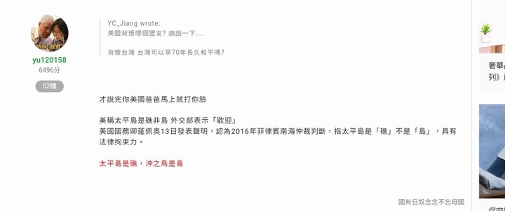 YC_Jiang wrote:美國背叛哪個盟友? 請說一下....背叛台灣 台灣可以享70年長久和平嗎? 才說完你美國爸爸馬上就打你臉美稱太平島是礁非島 外交部表示「歡迎」美國國務卿蓬佩奧13日發表聲明,認為2016年菲律賓南海仲裁判斷,指太平島是「礁」不是「島」,具有法律拘束力。太平島是礁,沖之鳥是島