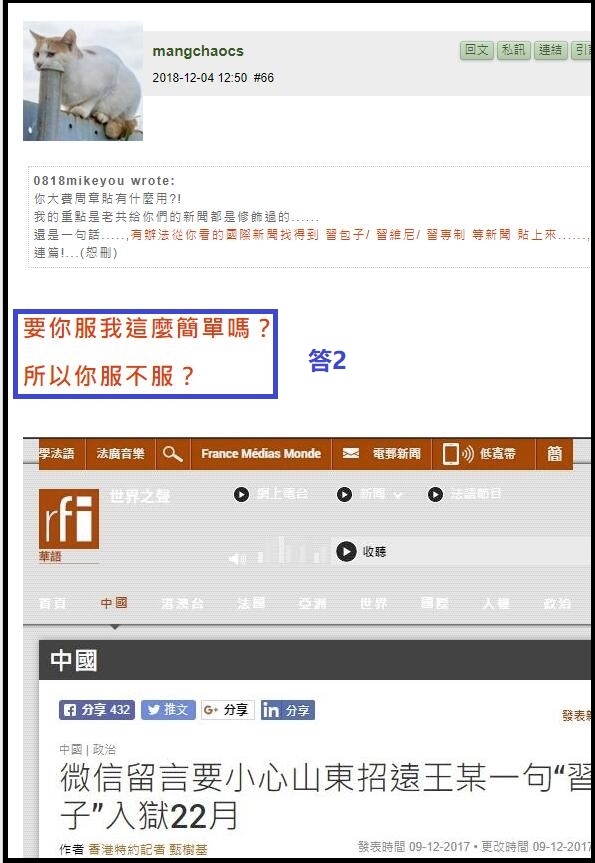 0818mikeyou wrote:你如果是從中國大陸內地找到的新聞貼上來的......,我就道謙!反之; 你的文如果是翻牆 or 人並非在中國大陸內地上網所找到的.......,那你就是作弊(假冒大陸上網可以找到的新聞)我的重點在於中國大陸對於新聞管控之嚴格超乎想像. 我一開始展示給你的就是境外媒體的中文版而已啊,是你自己沒見識還以為是大陸過濾過的新聞被我貼文打臉,現在又改口?你如果可以找到我哪句話說我秀給你看的那些媒體是中國大陸內地的,我也可以給你道歉喔。我把前後文都貼上來,誰在一路轉進硬拗一目了然。 哦對了,本樓的標籤是“追打2” 補充一條剛才疑似被某人自己回報回收的文: