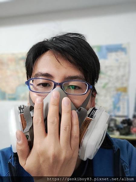 老樣子,戴上面具最重要的氣密測試,壓著濾罐做負壓測試,吸不到氣且面具塌陷就是氣密正確