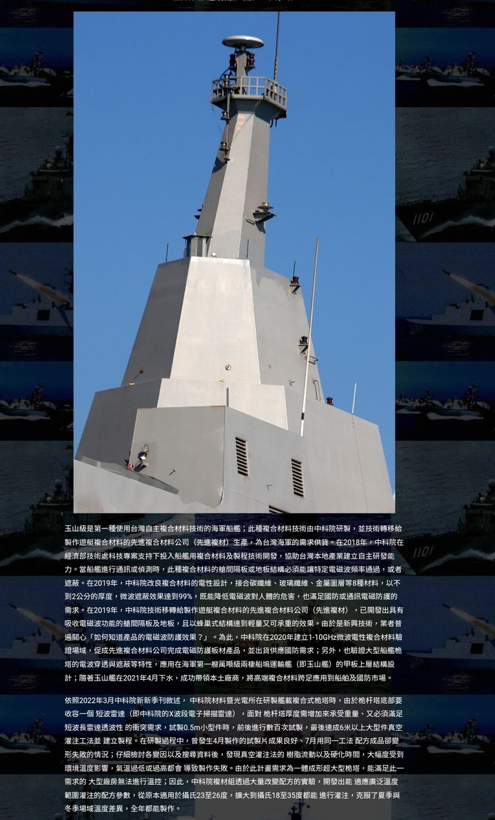 萊七逃 wrote:之前傳說中科院封閉式桅杆罩在玉山艦上測試,玉山艦快交付海軍應該是測試過關沒什麼問題,不知道這台富江艤裝階段會不會裝上去,有裝上是比較匿蹤整體簡潔好看一點。 對電磁波高透通性的複合材料桅杆罩對匿蹤並沒有什麼幫助,但是可減少設備受到風吹雨淋海水侵蝕,塔江級最需要裝複合材料桅杆罩的是後方的海蜂眼雷達天線,雖然複合材料重量較輕,對小船來說也是一項負擔,應該是不會裝上去 (塔江艦海蜂眼雷達天線下方的結構據說就是由複合材料所製成) 。