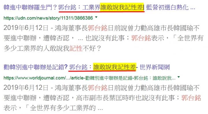 colinucc wrote:個人以為郭董情緒管...(恕刪) 我寧願選有能力的大老闆, 也不要選一個只敢躲在鐵韓粉中間作威作福, 一上台北見到產官學經驗都比自己強的競爭者, 就一副小媳婦的樣是不是失業在家相夫教子太久啦 還是嫁進李家後沒地位自卑?